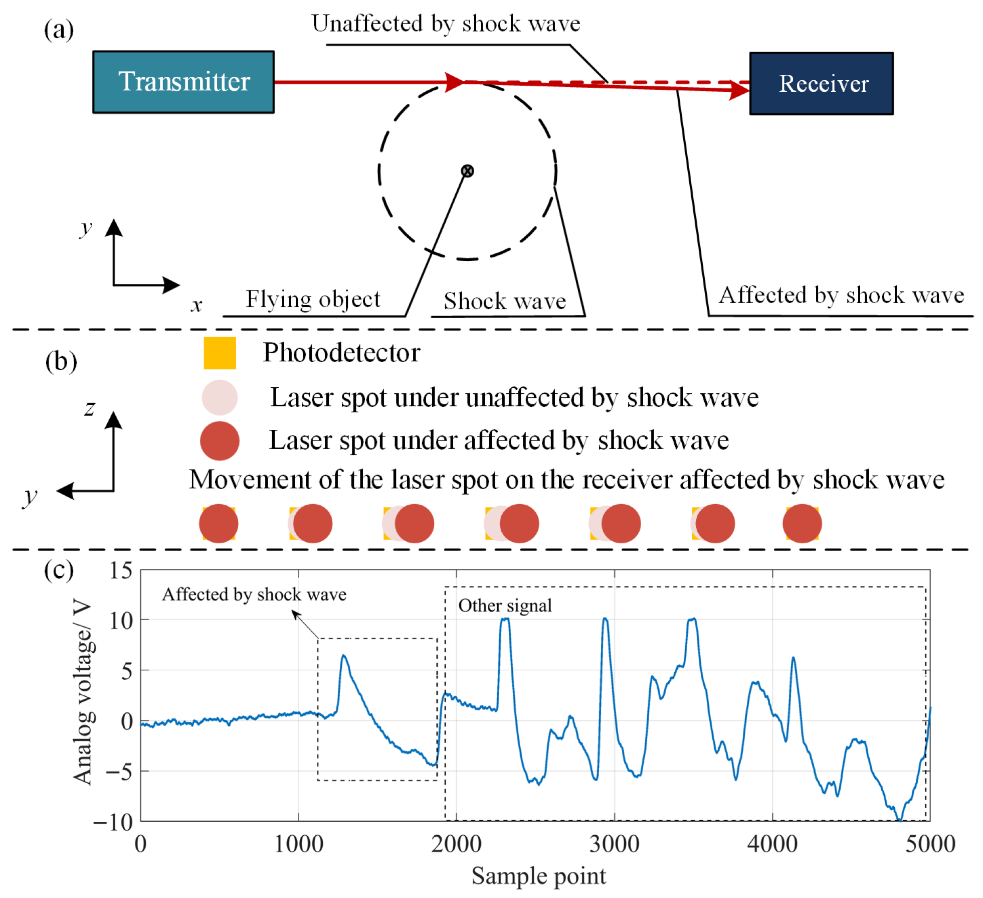 - Robustness to Environmental Factors: In the DRRLOMA, the LOMs make the system unsusceptible to environmental variables. Variations in environmental factors, such as temperature, humidity, and density, affect the propagation of the SW through the medium but do not influence the laser sensing path of the LOM. Once calibrated, the LOM in the DRRLOMA—provided that the transmitter and receiver remain aligned and no shock-wave interference from other FOs is present—generates a transient signal exclusively when a shock-wave arrives at its laser path. Otherwise, the system remains in a ready state. However, extreme turbulent airflow directly impinging on the laser paths could cause signal scintillation, a topic for future investigation in harsh environments.