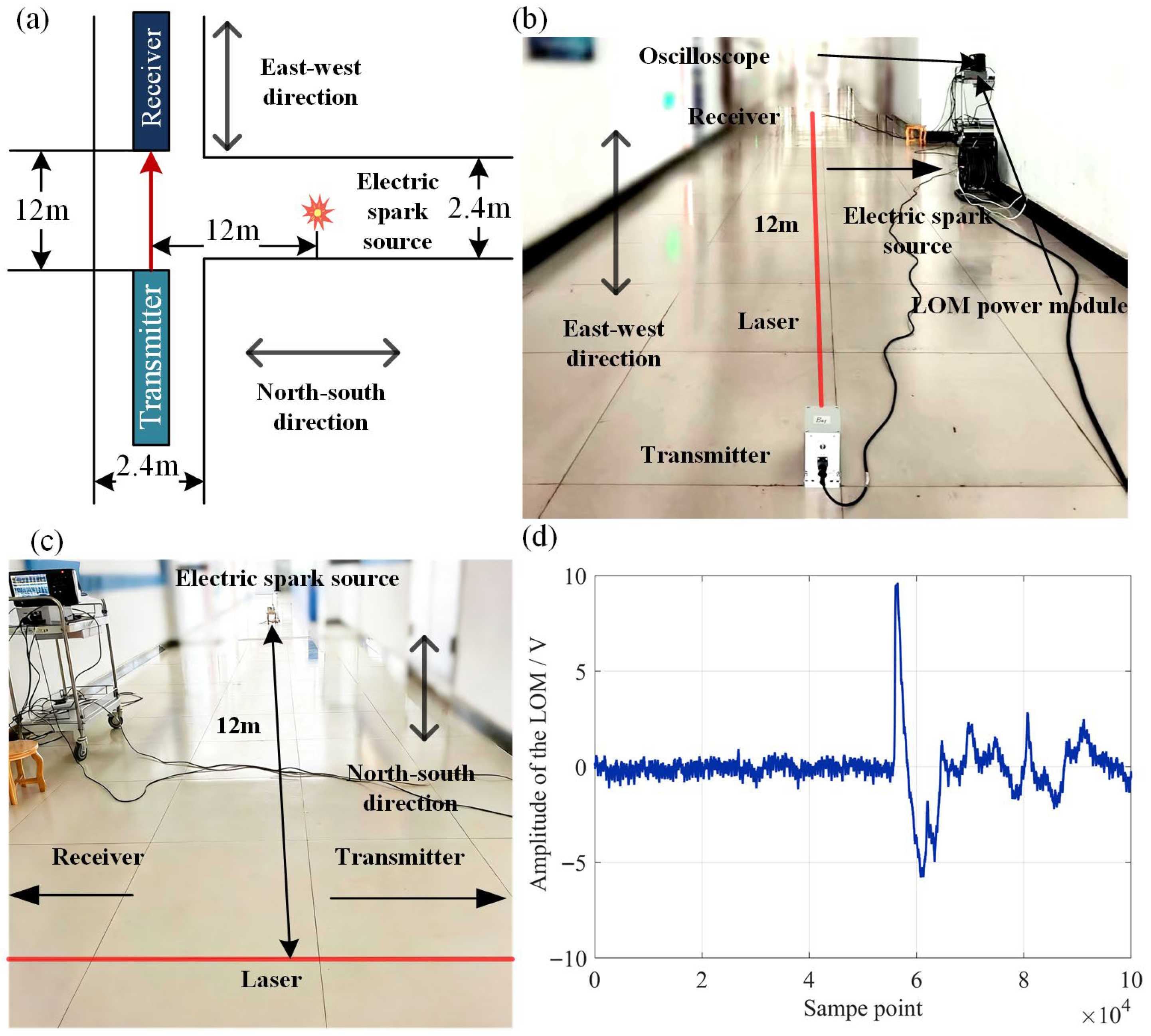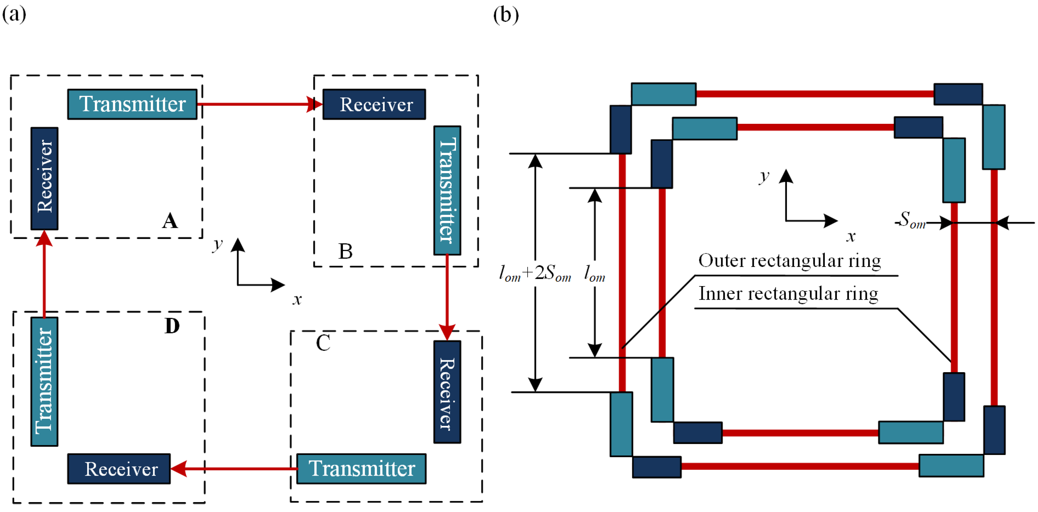 - To achieve large-area SW detection, a DRRLOMA, composed of linear optical microphone arrays, was developed. By leveraging the broad propagation characteristics of SWs [40] and the collimation properties of lasers, an array comprising eight LOMs was designed and arranged in both inner and outer rectangular ring configurations.
