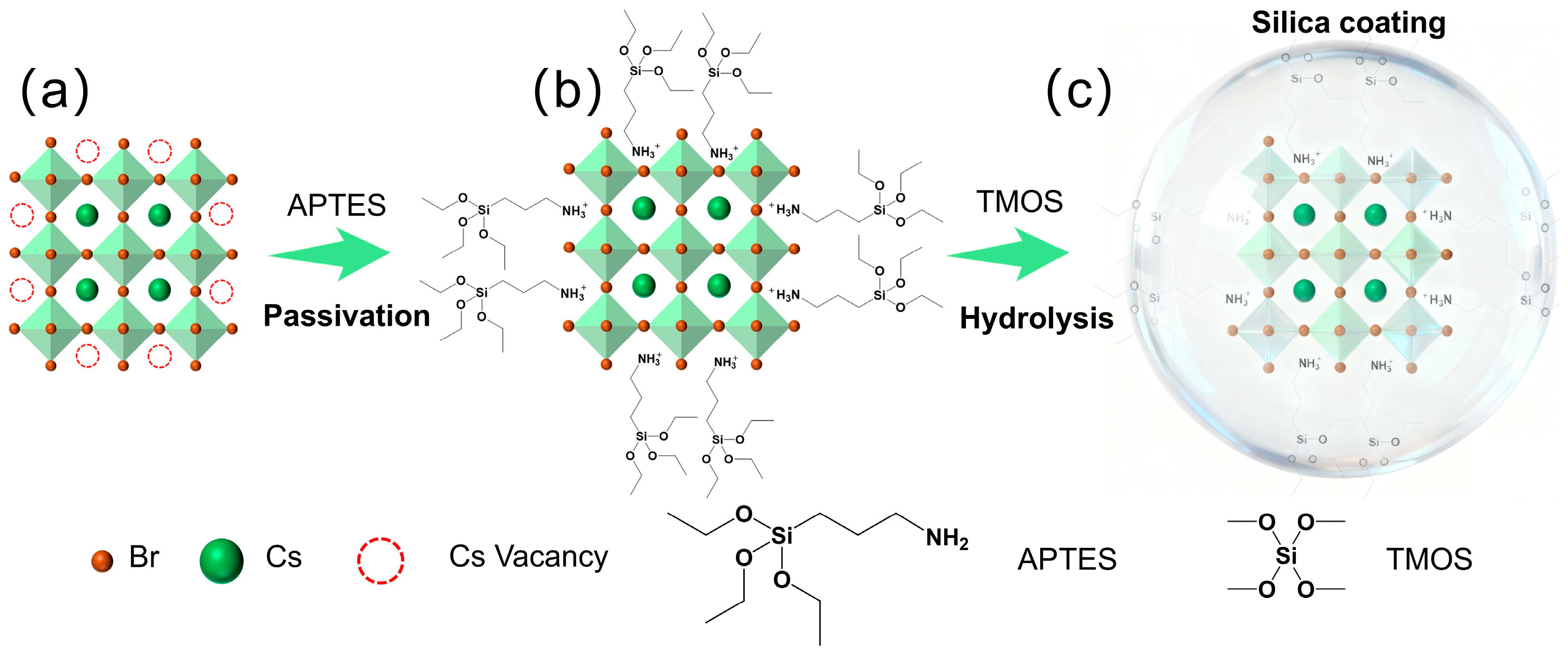 - Meng, C.; Yang, D.; Wu, Y.; Zhang, X.; Zeng, H.; Li, X. Synthesis of single CsPbBr3@SiO2 core-shell particles via surface activation. J. Mater. Chem. C 2020, 8, 17403–17409. [Google Scholar] [CrossRef]