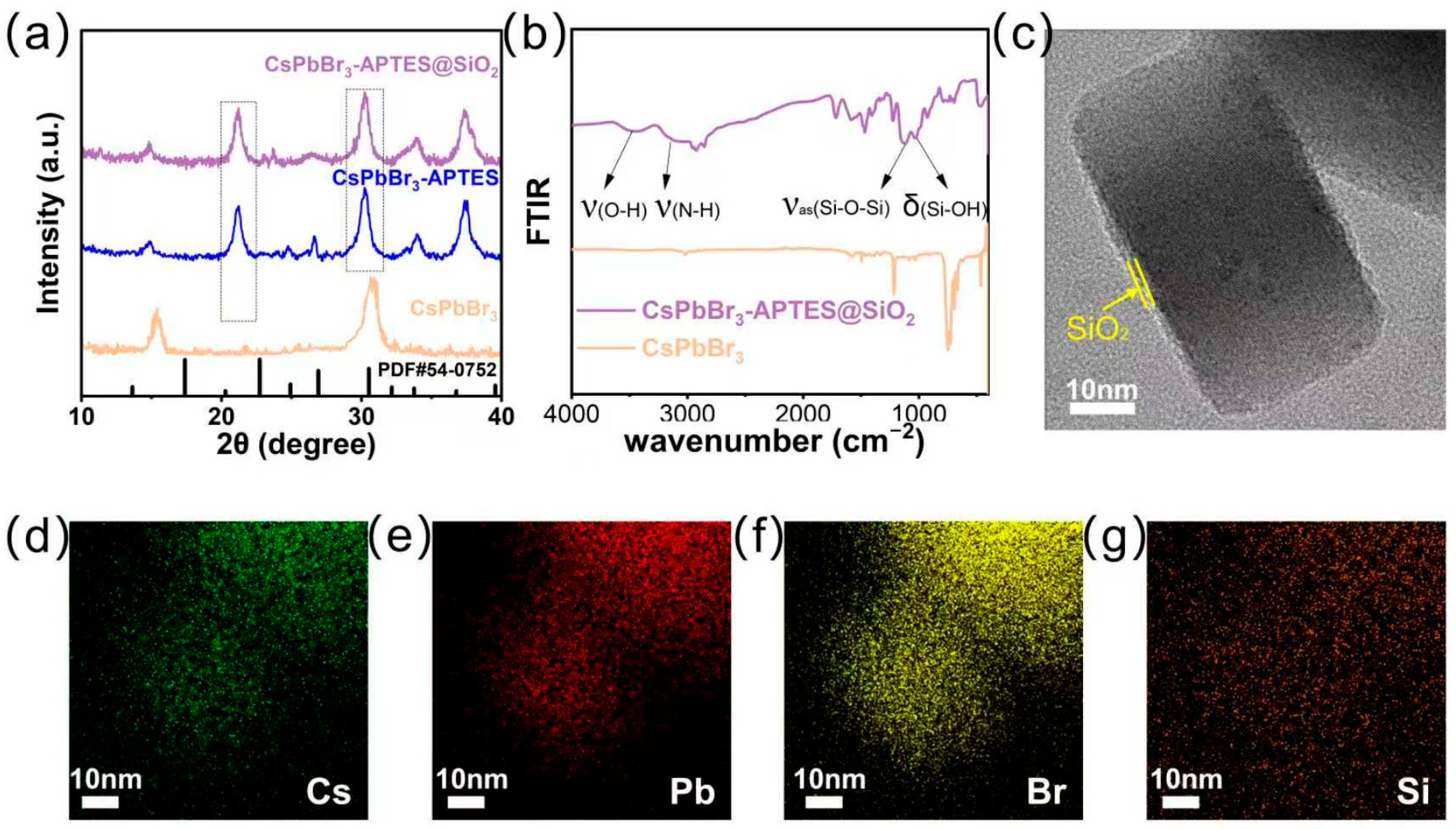 2.2.4. Preparation of CsPbBr3-APTES@SiO2 Core–Shell Nanoparticles