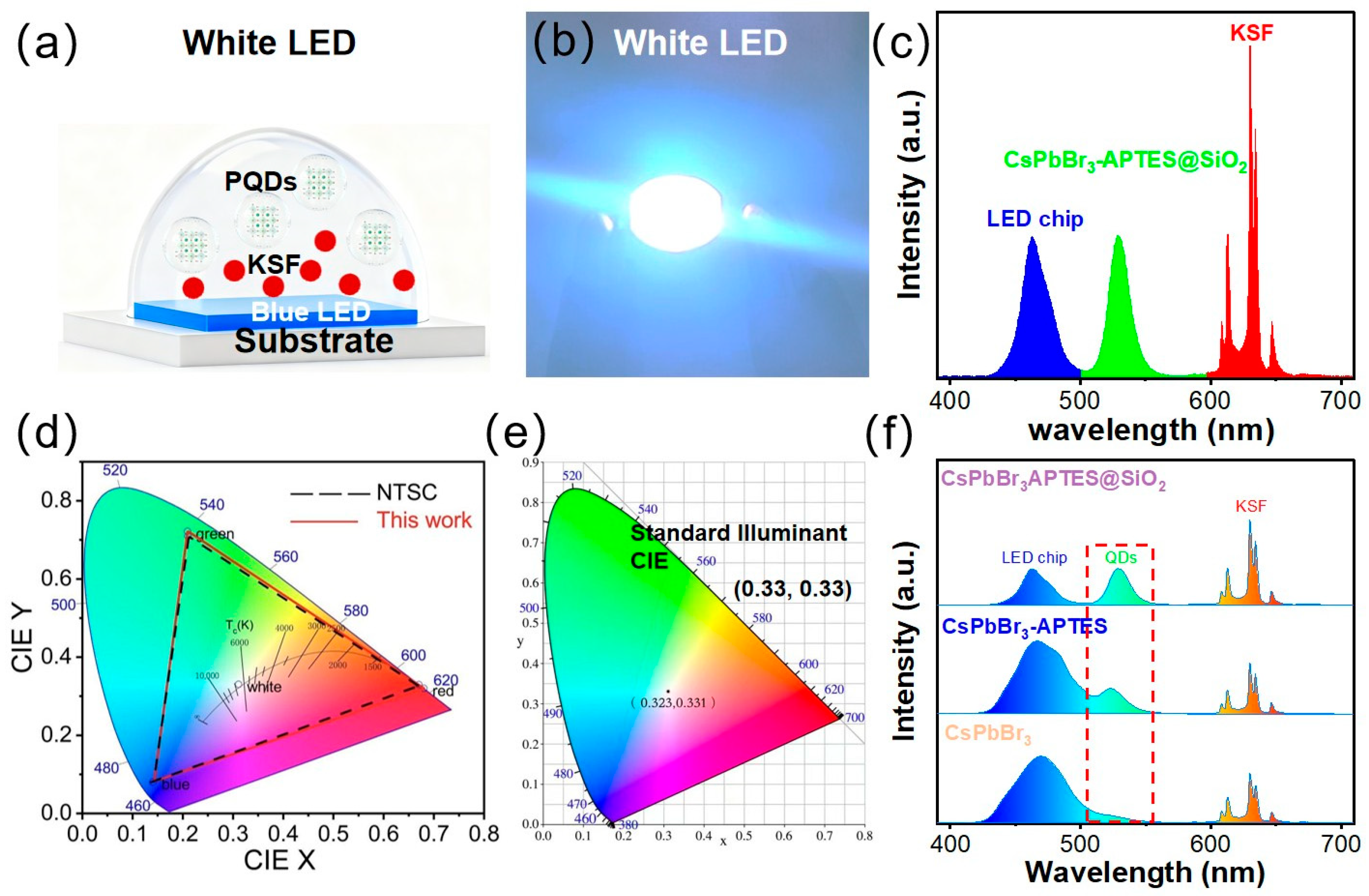Fan, C.; Luo, C.; Ding, Y.; Xia, S.; Wu, J.; Xiao, Y.; Chen, Y. Water-Stable Perovskite Quantum Dots for Wide-Color-Gamut White-Light-Emitting Diodes. Photonics 2026, 13, 108. https://doi.org/10.3390/photonics13020108