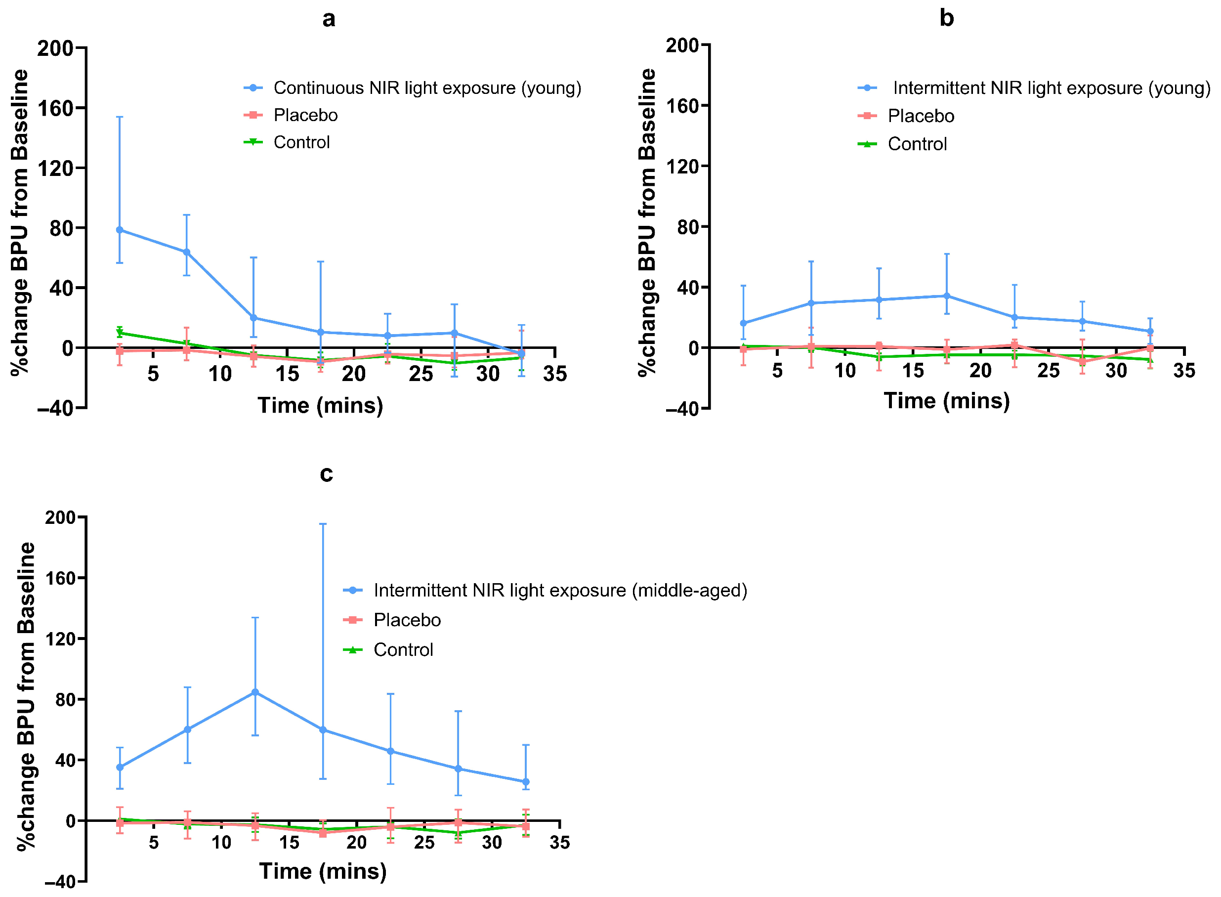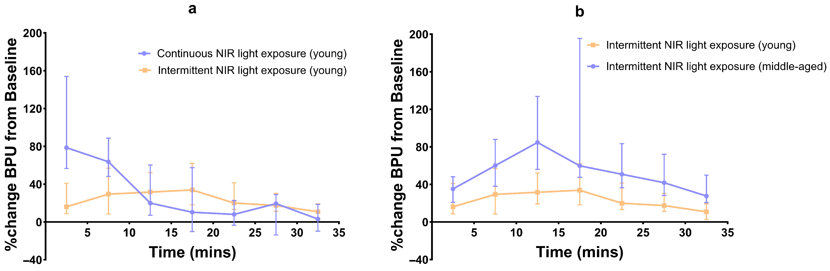 | Mode of NIR Light Exposure | Maximal Median (95% CI) BPU | Time Interval of Maximal BPU |