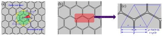 Hexagonal medium pores arranged in a triangular pattern. Two-dimensional structure diagram of a photonic crystal. (a) Brievich zone division diagram; (b) progenitor cell arrangement; (c) lattice parameters.