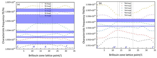 Electromagnetic wave propagation band diagram of a photonic crystal with hexagonal unit cells arranged in a triangular lattice. (a) TE band of the transverse electric mode; (b) transverse magnetic mode TM band.