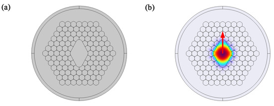One approach to achieving birefringence is to break the symmetry of the fibre core structure. The mechanism by which it produces birefringence is as follows: Within the asymmetric cross-section of the optical fibre, an anisotropic waveguide environment is formed. This anisotropy causes the two fundamental orthogonal polarisation states of the light wave to propagate at different phase velocities, thereby inducing the birefringence effect. This serves as the fundamental design basis for the design of the bandgap birefringent optical fibre discussed herein. This paper designs two birefringent bandgap fibre core structures—elliptical and rhombic cores—by altering the core geometry or modifying the arrangement of air holes in the cladding. Figure 3 illustrates the schematic of an asymmetric hollow-core bandgap fibre structure, wherein the hollow region adopts a rhombic configuration [17]. This design enables a flexible control over the asymmetry of the core structure, thereby enhancing the birefringence effect.