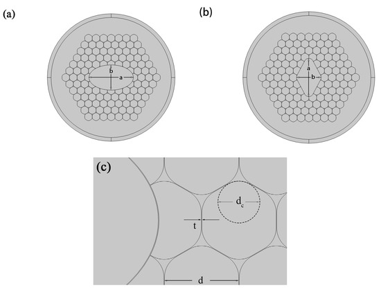 The fibre core structure designed herein strives for simplicity and regularity while maintaining asymmetry. An elliptical core and a rounded diamond-shaped core structure have been designed. By appropriately adjusting the temperature field, vacuum pressure, and boundary conditions during the preparation process, the feasibility of the fabrication process is significantly enhanced. Moreover, the advent and application of sol–gel techniques, 3D technologies, and precision extrusion methods in optical fibre fabrication processes will also provide multiple viable technical pathways for the production of hollow-core photonic bandgap fibres.