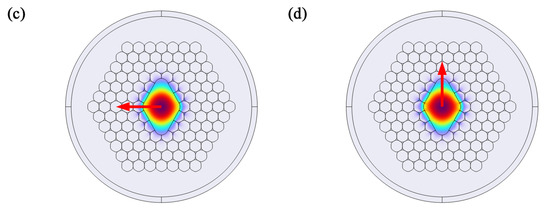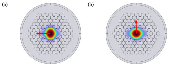 Figure 5 shows the electric field mode field diagrams of polarised light for the elliptical hollow-core photonic bandgap fibre (designated as E-BPCF) and the rhombic hollow-core photonic bandgap fibre (designated as D-BPCF). The arrows indicate the x and y electric polarisation directions of the fibre mode field. Through simulation calculations, the polarisation intensity distribution values in two directions were obtained, denoted as Ey and Ex. According to wave theory, the distribution of the birefringent mode field determines the extent to which light wave energy is confined within the fibre core, meaning E(x,y) is the physical reason for the specific values of neff being generated. If Ey/Ex = 1, it indicates that neffx and neffy are degenerate states within the same waveguide mode. However, when Ey/Ex ≠ 1, neffx and neffy are lifted out of degeneracy, indicating a distinct occurrence of the birefringence effect. It should be noted that, for the calculation results of Ex and Ey, the two orthogonal components of the electric field mode E(x,y), COMSOL does not perform normalisation processing. However, it provides the calculated values of Ex and Ey under the same structural conditions, and the ratio of Ex to Ey may not be equal to 1, which can indirectly reflect the polarisation information of the mode field. The electric field intensity ratios of the two polarised mode fields shown in Figure 5 are 0.86 and 1.51, respectively. This demonstrates that both the elliptical core and the rhombic core exhibit pronounced birefringence characteristics.