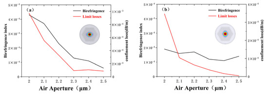 As shown in Figure 6a, at r = 2.0 μm, the confinement loss of the E-BPCF remains relatively high at 9.7 × 10−1 dB/km. This is because the limited photonic bandgap formed by the small air core cladding radius restricts light confinement, leading to the easy leakage of core modes into the cladding. As r increases, loss decreases rapidly, reaching its minimum at r = 2.3 μm with a value of 9.4 × 10−2 dB/km. Beyond r = 2.3 μm, the loss curve tends to be flat. Similarly to E-BPCF, D-BPCF exhibits a relatively high confinement loss at r = 2.0 μm (3.4 × 10−1 dB/km). However, as r increases, the confinement loss of D-BPCF decreases rapidly. At corresponding radii of 2.3 μm, 2.4 μm, and 2.5 μm, the confinement losses are 3.7 × 10−2 dB/km, 1.6 × 10−2 dB/km, and 4.4 × 10−3 dB/km, respectively. The D-BPCF exhibits stronger optical confinement capabilities over the core region compared to the E-BPCF, resulting in a limitation loss that is one order of magnitude lower than that of the E-BPCF.