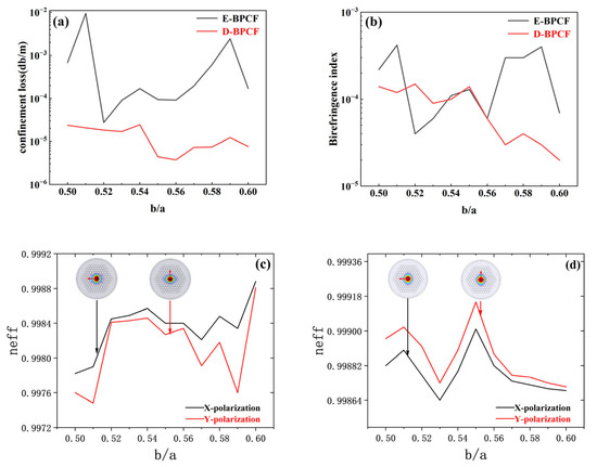 Under conditions where d = 2.3 μm for the E-BPCF and d = 2.5 μm for the D-BPCF, the properties of birefringence and confinement loss in both E-BPCF and D-BPCF can be regulated by the ratio b/a of the short semi-axis b to the long semi-axis a. In this design, the loss curve with b/a ranging from 0.50 to 0.60 and the birefringence coefficient curve are depicted in Figure 7. Figure 7a shows the loss curve and Figure 7b displays the birefringence coefficient curve, while Figure 7c and Figure 7d, respectively, illustrate the real-part refractive index curves of the X and Y mode fields for the E-BPCF and D-BPCF.