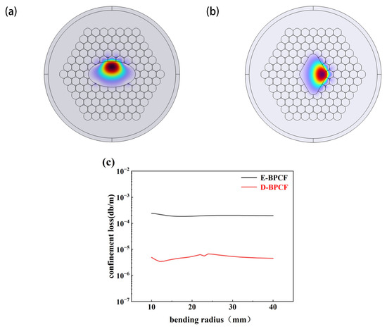 Variation in loss in E-BPC and FE-BPCF with bending radius, and mode field diagram during bending. (a) E-BPCF bending modulus; (b) D-BPCF bending modulus; (c) relationship between bending radius and confinement loss.