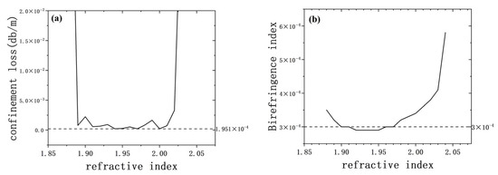 Tellurium–bismuthate glasses exhibit a relatively high refractive index. In 2025, Hrabovský, Jan et al. investigated the linear and nonlinear optical properties, as well as magneto-optical characteristics, of TeO2–BaO–Bi2O3 (TeBaBi) glasses prepared using conventional melt-quenching techniques. These glasses exhibit high refractive indices, Verdet constants, and optical bandgap energies, with refractive indices ranging from 1.922 to 2.084 at a wavelength of 1.55 μm [23]. In 2025, Tan Fang et al. investigated the structural evolution and 2 μm luminescence of Yb3+/Ho3+ co-doped bismuth tellurate laser glass. The researchers employed a melt annealing method to prepare samples with varying concentrations of Yb3+ and Ho3+ ions, analysing their thermal stability, structural properties, and luminescent performance. The results indicated that, through multicomponent modulation and structural evolution, the glass matrix density increased, with significant enhancements in the refractive index and thermodynamic properties [24]. Tellurium–bismuth oxide glass exhibits a relatively low melting temperature. During the fabrication of hollow-core bandgap fibres, this property enables thermodynamic processes to reduce surface roughness on the core. The lower fabrication temperature not only reduces energy consumption but also helps mitigate the adverse effects of high temperatures on the fibre structure and performance, offering distinct technological advantages. This experiment simulated the confinement loss and birefringence coefficient of E-BPCF at a wavelength of 1.55 μm under refractive indices ranging from 1.89 to 2.04. Figure 10 shows the performance of EBT-BPCF across the refractive index range of 1.89–2.04, with the dashed line indicating the performance of the previously mentioned optimised structure at a refractive index of 1.44.