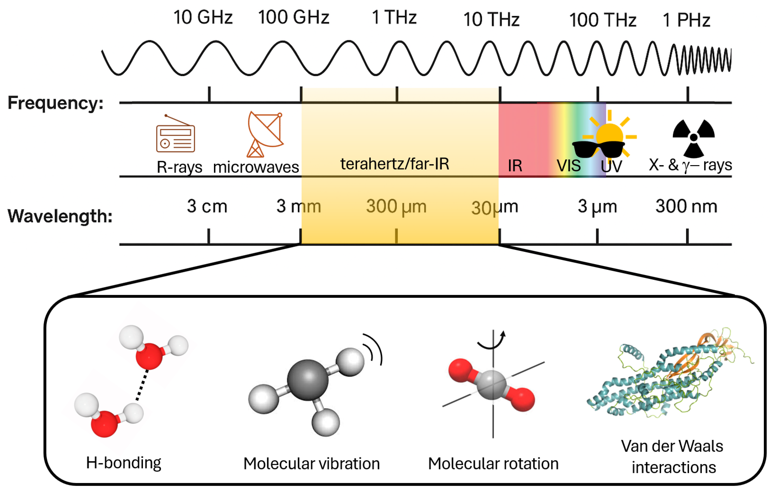 - Sun, L.; Zhao, L.; Peng, R.-Y. Research progress in the effects of terahertz waves on biomacromolecules. Mil. Med Res. 2021, 8, 28. [Google Scholar] [CrossRef] [PubMed]