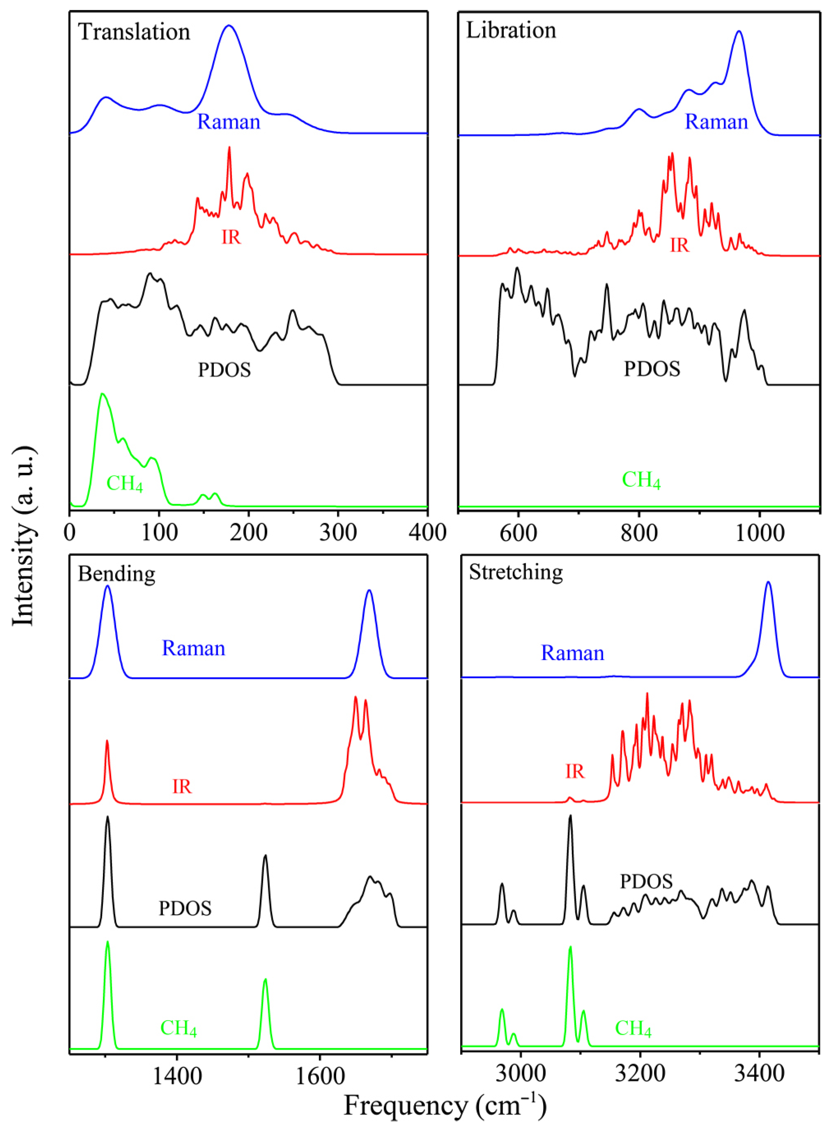- Ramya, K.R.; Pavan Kumar, G.V.; Venkatnathan, A. Raman Spectra of Vibrational and Librational Modes in Methane Clathrate Hydrates Using Density Functional Theory. J. Chem. Phys. 2012, 136, 174305. [Google Scholar] [CrossRef] [PubMed]