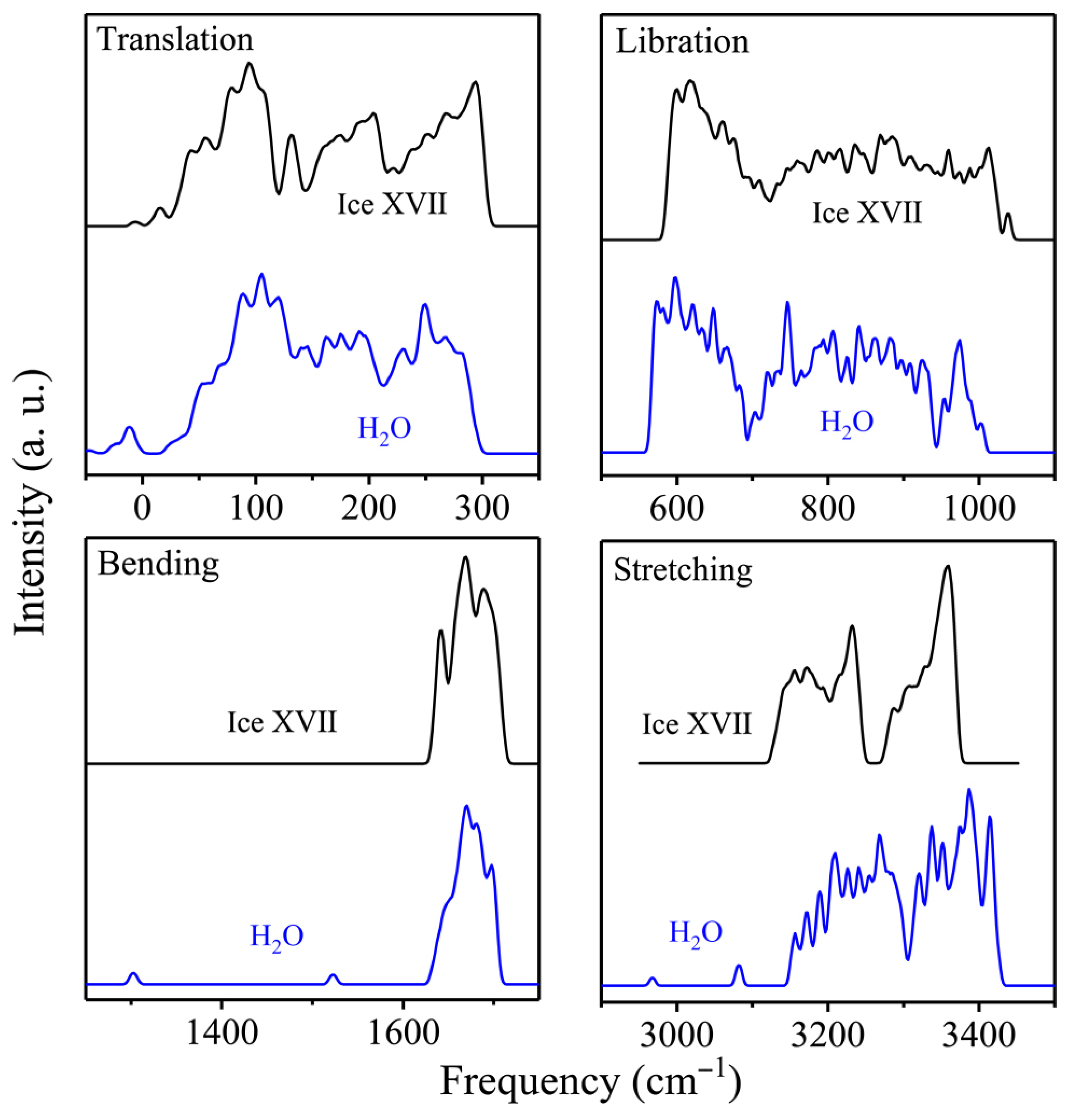 - Zhu, X.-L.; Yuan, Z.-Y.; Jiang, L.; Zhang, K.; Wang, Z.-R.; Luo, H.-W.; Gu, Y.; Cao, J.-W.; Qin, X.-L.; Zhang, P. Computational Analysis of Vibrational Spectrum and Hydrogen Bonds of Ice XVII. New J. Phys. 2019, 21, 043054. [Google Scholar] [CrossRef]