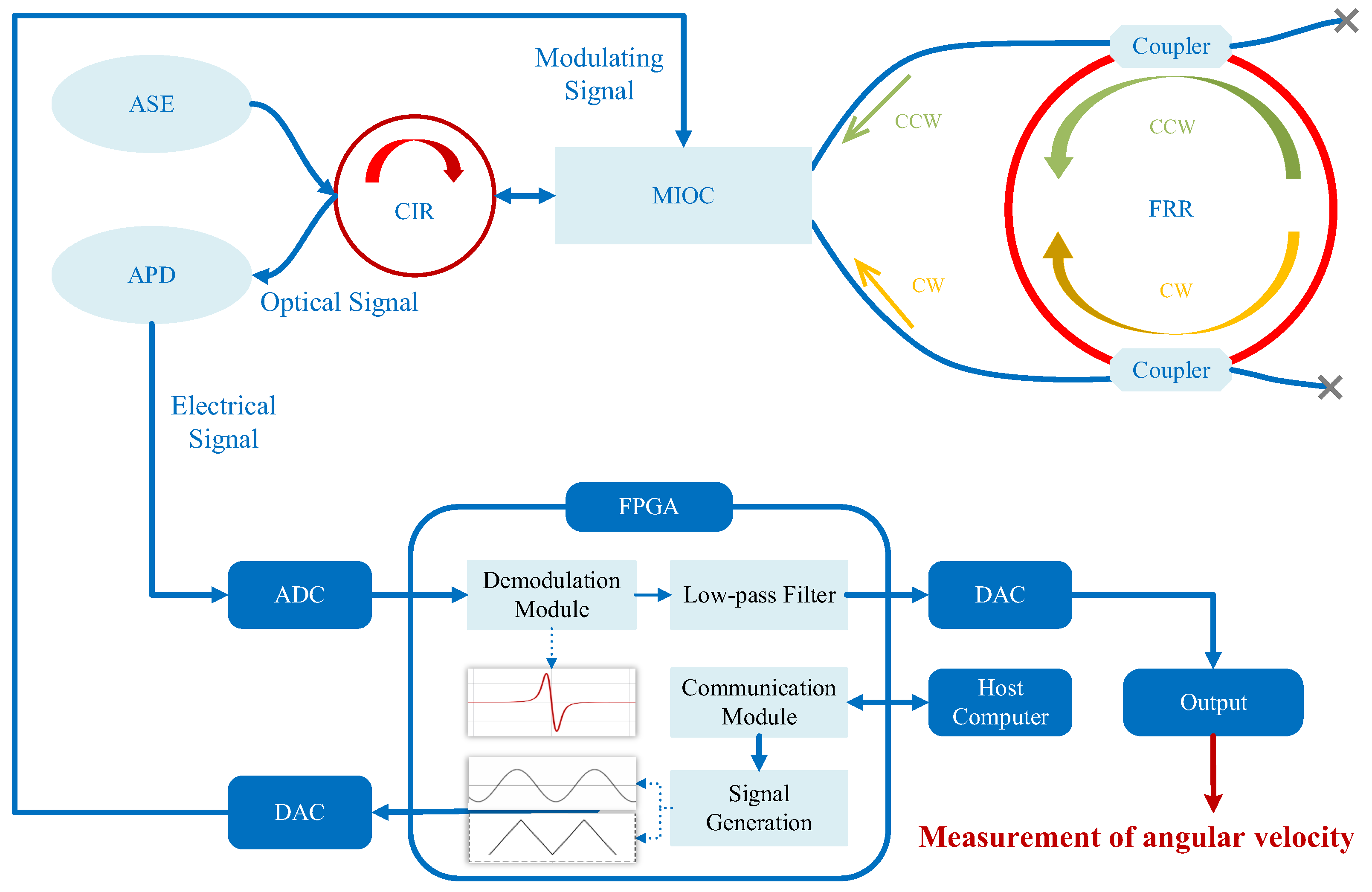 - Li, H.; Lin, Y.; Liu, L.; Ma, H.; Jin, Z. Signal processing improvement of passive resonant fiber optic gyroscope using a reciprocal modulation-demodulation technique. Opt. Express 2020, 28, 18103–18111. [Google Scholar] [CrossRef] [PubMed]