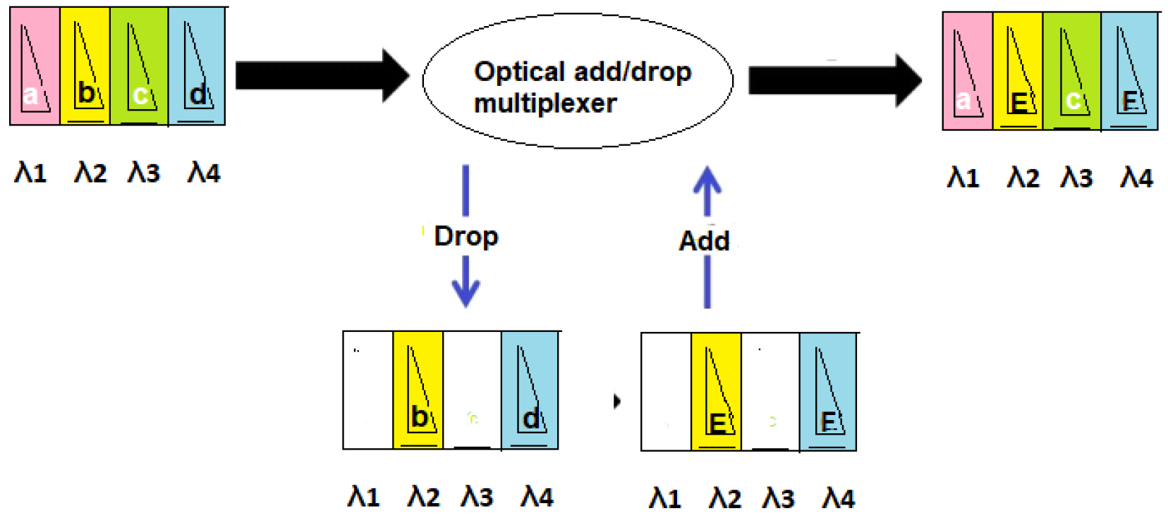 14] since it allows for the interconnection of offices or sites via a variety of add-drop channels, such as an interoffice ring. In multi-wavelength fiber spans used in WDM systems, OADM is implemented to enable the demultiplexing (dropping) and multiplexing (adding) of a particular wavelength while allowing the passage of the other wavelengths. It can therefore give optical networks flexibility and scalability by allowing users to alter how existing fiber is used by adding or removing channels on a per-site basis. This leads to an expansion of the available fiber bandwidth, thereby empowering the optical add-drop multiplexer to play a pivotal role in improving and optimizing network performance. The placement of a node at each site or consideration of extracting or introducing a signal into the flow would have been required in the absence of OADM, and this would have undoubtedly mobilized additional investment [