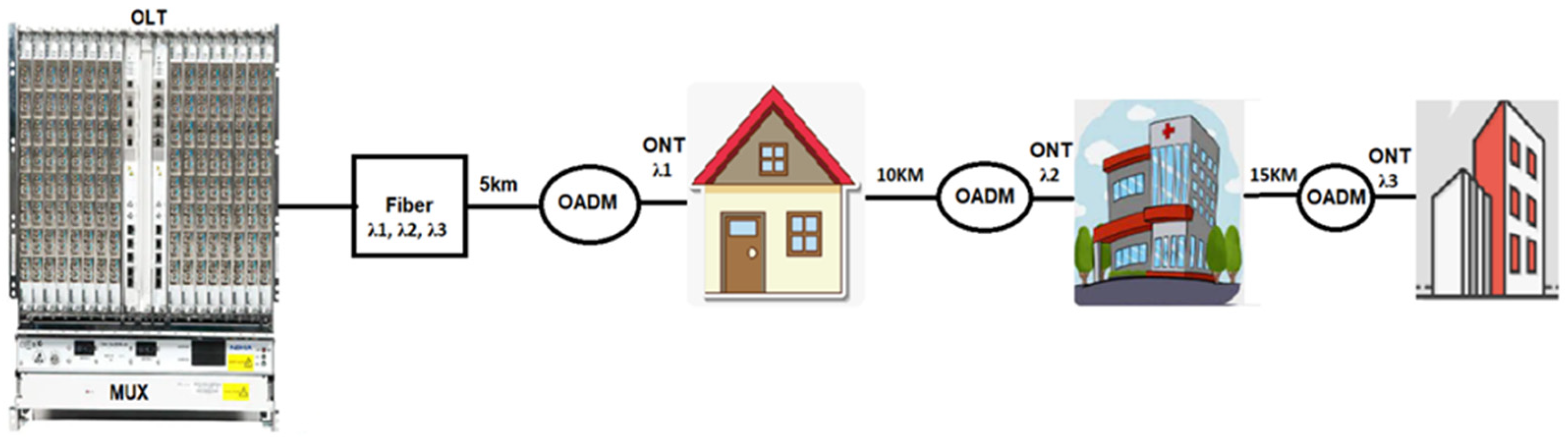 21], each client will have its dedicated fiber. Because it is more complicated, this last option is rarely used. The main optical access point for clients using the FTTx is the OLT (optical link terminal). The distribution of services like the internet, phone, and video is made possible by this active device at the center, which sends and receives light signals carrying data. The ONT, which is an optical network terminal component, serves as the direct OLT interlocutor and can be viewed as an optical mode that the client uses to connect to their broadband access gateway. The multiplexer is an integrated part that acts as a concentrator for the transmission. It enables the addition of optical signals for combining. The fiber is placed after the OLT to transport the wavelengths over long distances to the OADM, which allows the desired wavelength to be extracted after a precise distance. Depending on the location and strategy of the business, it employs either the Gigabit Passive Optical Network (GPON) [