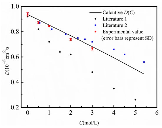 Comparison chart of measured diffusion coefficients at different concentrations with literature values. The black solid line represents the D(C) curve calculated by the finite difference method in this work; the red dots denote the experimentally measured D values at different concentrations; the blue box represents the literature value 1 [25]; the black dots represent the literature value 2 [26].