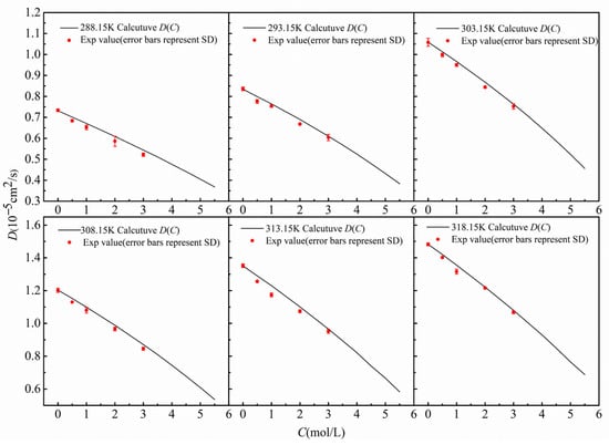 Under the condition of 298.15 K, the diffusion coefficients corresponding to concentrations were calculated based on the D(C) relationships from the eight time points. The resulting diffusion coefficients were stable (standard deviation ≤ 0.01 × 10−5 cm2/s). Therefore, the average of the undetermined parameters from these eight time points was taken as the optimal undetermined coefficients at this temperature, namely k1 = −0.0886, k2 = −0.0005, and k3 = −0.0001. Using the above method, the D(C) relationship for β-alanine at temperatures ranging from 288.15 K to 318.15 K was calculated, as shown in Table 5.