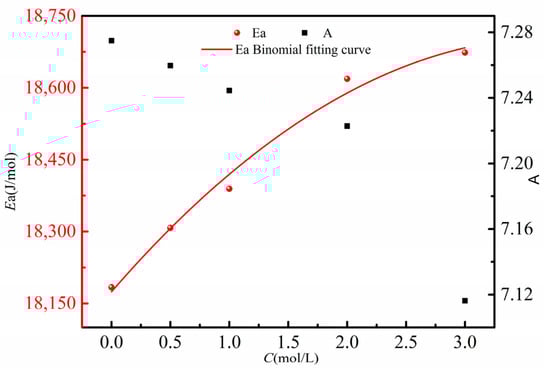 Performing a quadratic fit on the five sets of experimentally calculated diffusion activation energies Ea and concentration C data, as indicated by the red solid line in Figure 8, yields the following relationship between the diffusion activation energy Ea and concentration C: