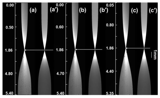 As an example, for the measurement of diffusion in β-alanine aqueous solution at 298.15 K, the CMOS was fixed at the position for clear imaging of the liquid thin layer with a refractive index of 1.3616. The simulated images based on the D(C) relationship calculated using the finite difference numerical calculation comparison method are shown in Figure 9a′–c′.