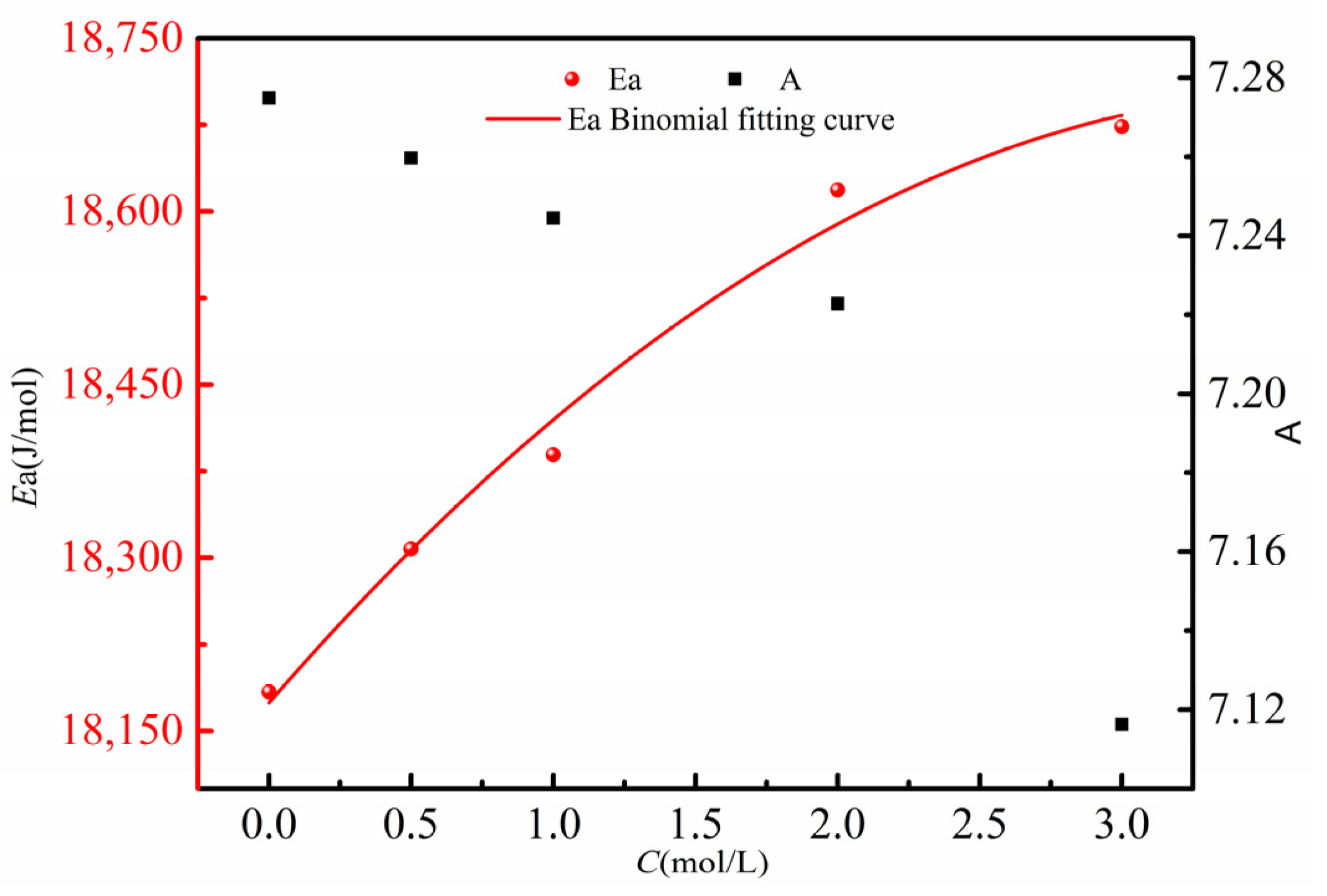 Performing a quadratic fit on the five sets of experimentally calculated diffusion activation energies Ea and concentration C data, as indicated by the red solid line in Figure 8, yields the following relationship between the diffusion activation energy Ea and concentration C: