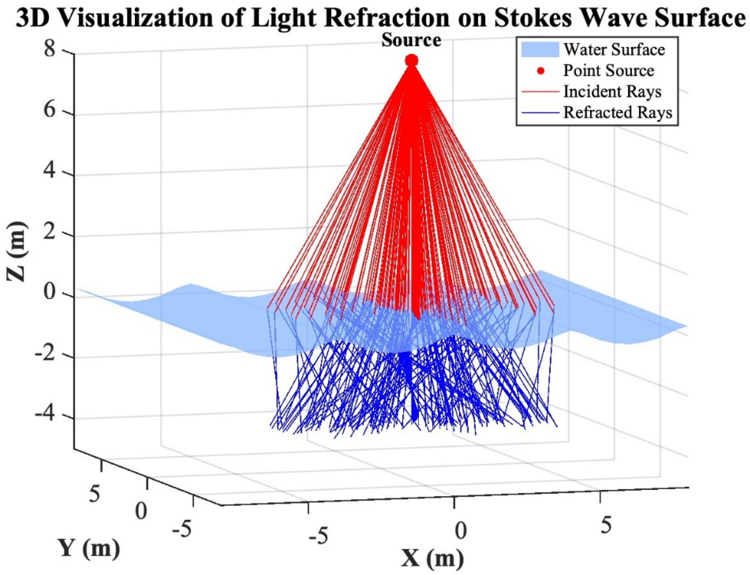 15]. Unlike sinusoidal or first-order approximations, the Stokes expansion incorporates higher harmonics of the wave phase, capturing the asymmetry between crests and troughs and thus yielding a more realistic depiction of real sea surface profiles. By combining this wave representation with Snell’s law and Fresnel transmission coefficients, each individual light ray experiences a locally defined surface slope and normal, resulting in the precise computation of incidence, refraction, and transmission angles. The model thereby accounts for spatial variations in surface curvature and their corresponding influence on light distribution below the surface.