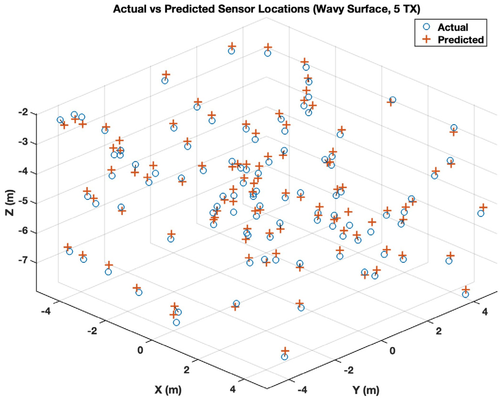 Figure 8 provides a visual comparison between the predicted sensor coordinates and the corresponding ground-truth when the sensor receives five transmissions.