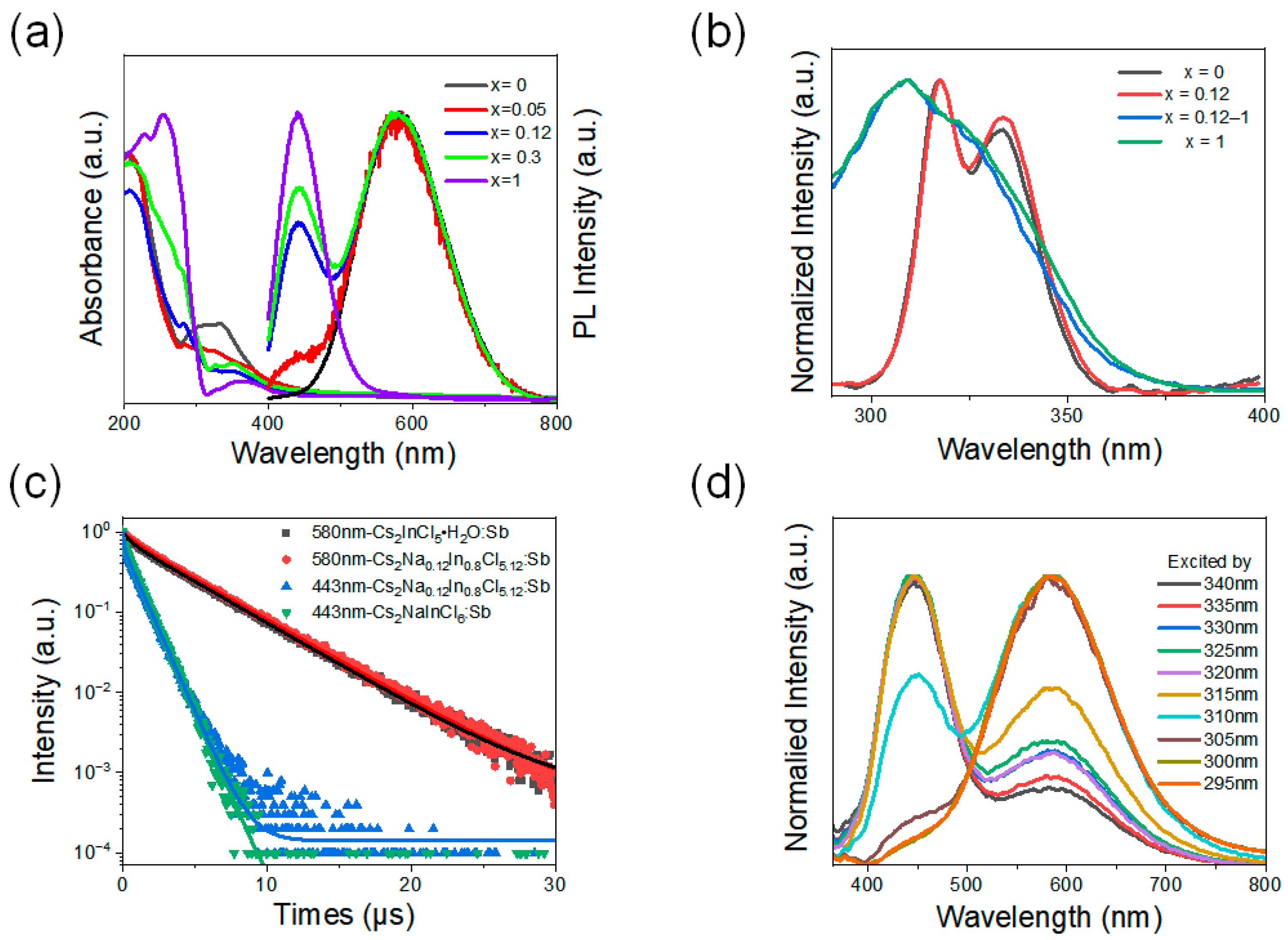5.12:Sb sample, the fluorescence lifetime of the blue emission was measured as 1.06 μs, while that of the yellow emission was determined to be 4.13 μs. This finding confirms the presence of two distinct exciton recombination channels in the sample, which are attributed to Cs
