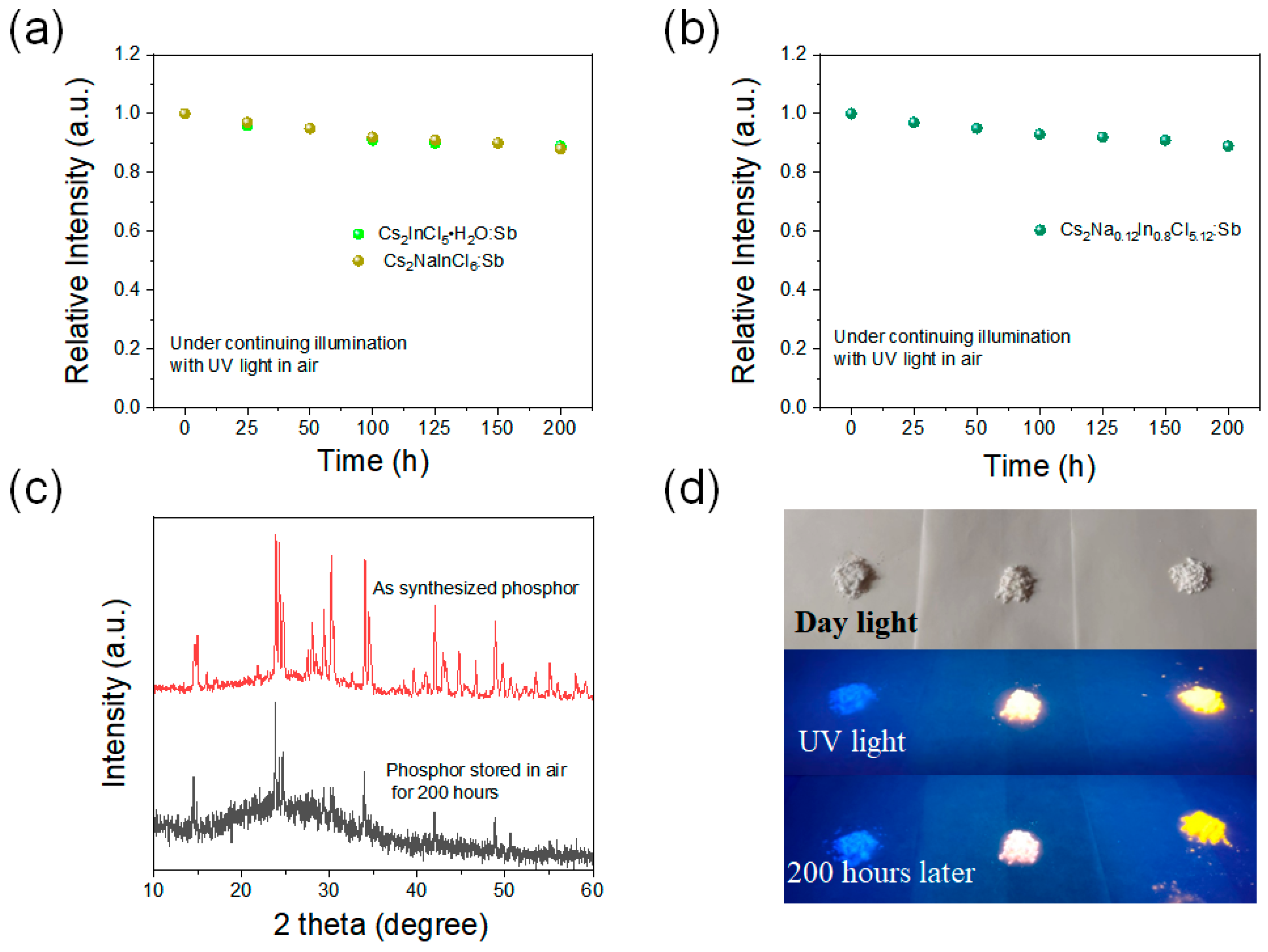 2O:Sb exhibit superior luminescent performance, achieving broadband blue and yellow emissions under a comparable excitation wavelength range (295–365 nm), thereby meeting the requirements for high-efficiency WLEDs. The stability of phosphors is a critical factor that significantly influences the performance of WLEDs.