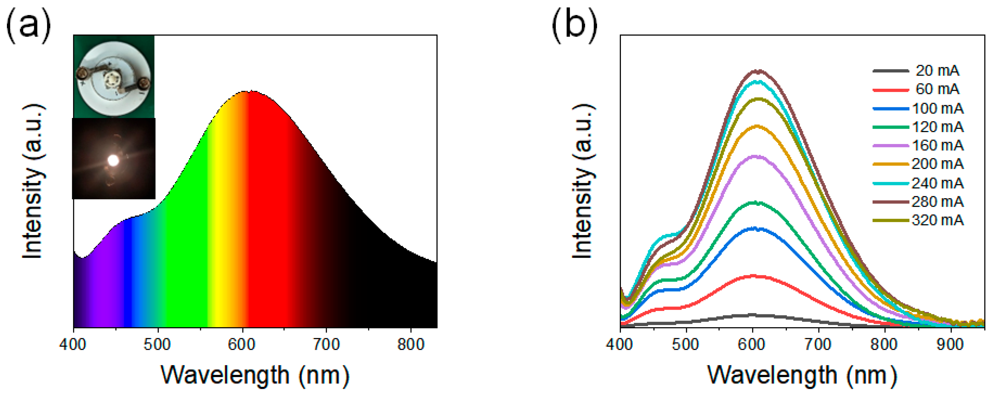 Figure 5a, the WLED device demonstrates a bright electroluminescence (EL) at a driving current of 240 mA. The CIE 1931 chromaticity coordinates are measured to be (0.4288, 0.4034), with a color rendering index (Ra) of 88.5 and a CCT of 3136 K for white light emission. The emission spectra of the LED at various forward bias currents (ranging from 20 to 320 mA) under different current densities are presented and the output power of white light emission exhibits a monotonic increase with the rise in forward current. Under varying driving currents, the spectra demonstrate negligible emission shifts, and the color temperature of the LED remains relatively stable, fluctuating only slightly within the range of 3027 to 3225 K (