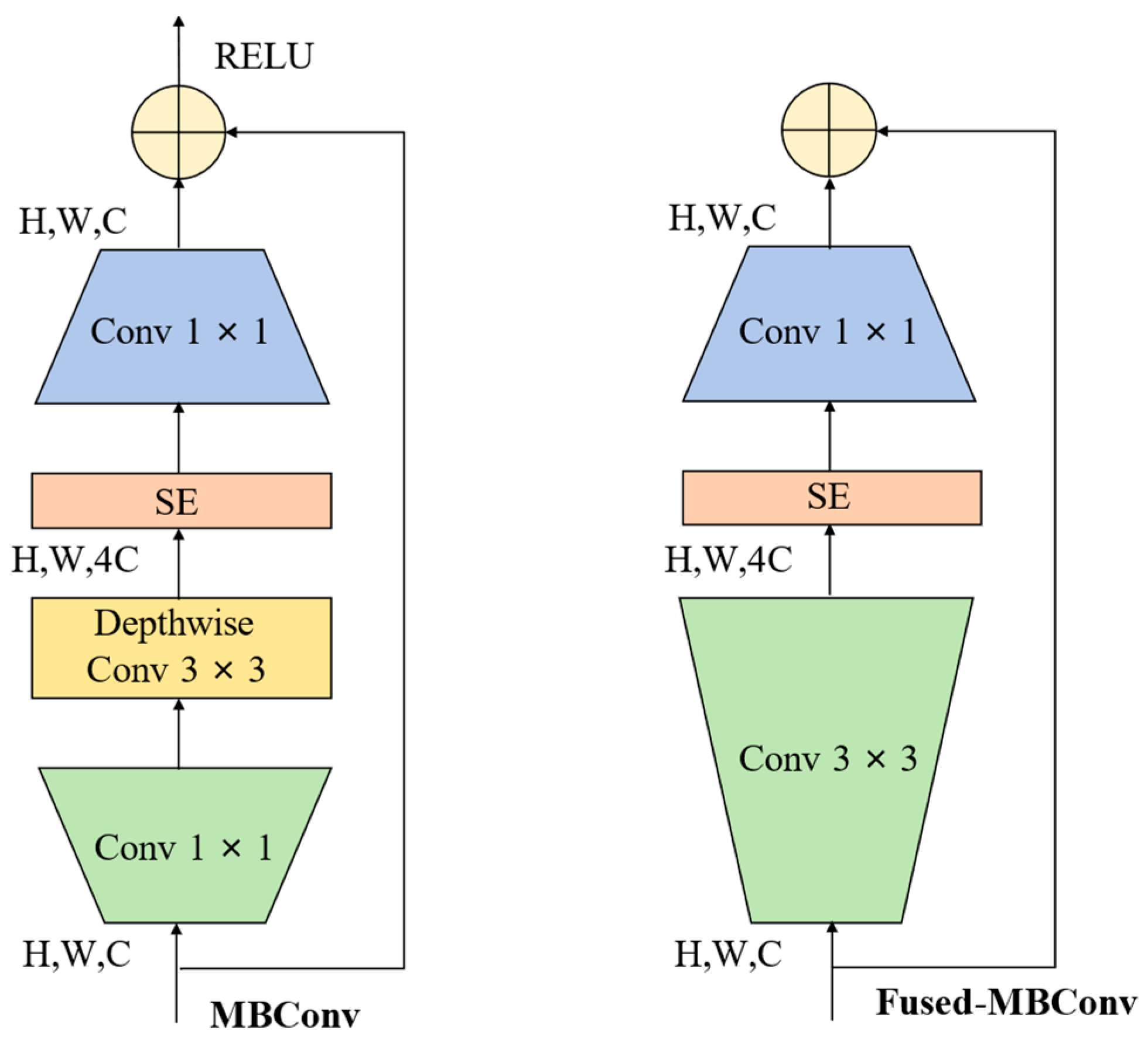 EfficientNetV2 is organized into multiple stages, with each stage built upon the Fused-MBConv block as the fundamental unit. Compared with the original EfficientNet, EfficientNetV2 introduces three key improvements to enhance training efficiency and feature representation. First, the Fused-MBConv module, as illustrated in