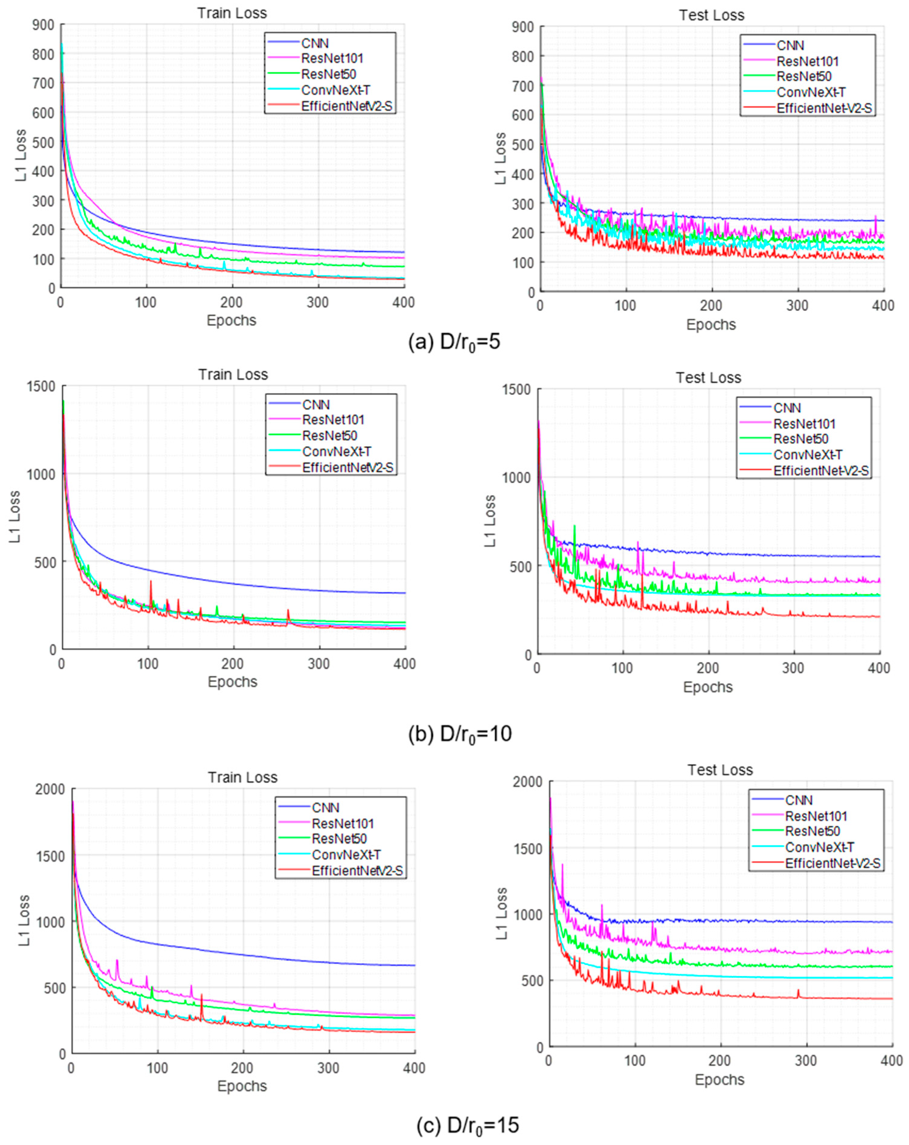 As the turbulence strength increases, EfficientNetV2-S shows a more pronounced advantage over the other models. This is mainly attributed to the efficient feature extraction of Fused-MBConv, the enhanced channel representation provided by SE attention, and the well-balanced depth–width configuration enabled by compound scaling. Meanwhile, the chart indicates that ResNet50 outperforms ResNet101 in both loss value and wavefront detection accuracy. Increasing network depth introduces more nonlinear transformations, which may cause feature information to degrade and lead to “network degradation”, making training more difficult. Although residual connections can mitigate this effect, their benefit diminishes when the network becomes excessively deep, resulting in poorer training performance.