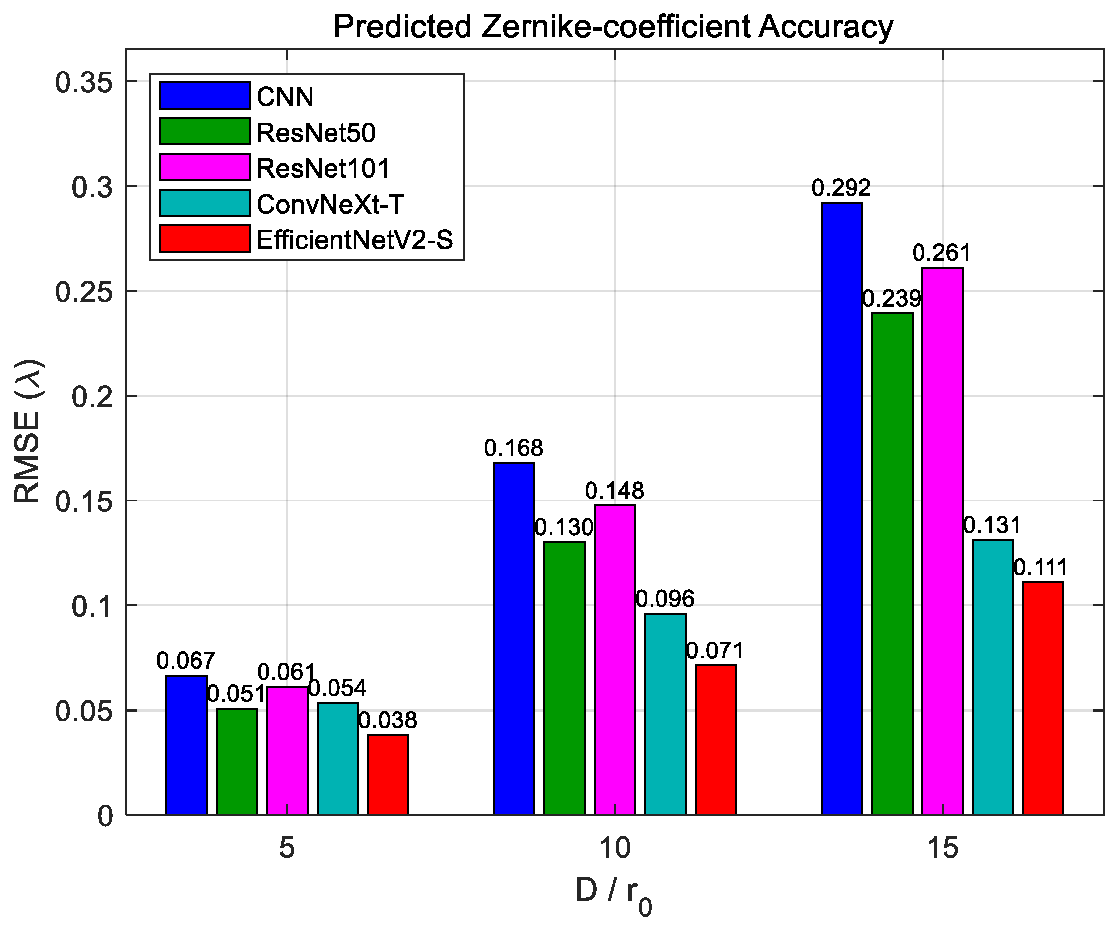 r0 = 5, the ZRMSE of the conventional CNN, ResNet50, ResNet101, ConvNeXt-T, and EfficientNetV2-S are 0.067λ, 0.051λ, 0.061λ, 0.054λ, and 0.038λ, respectively. When