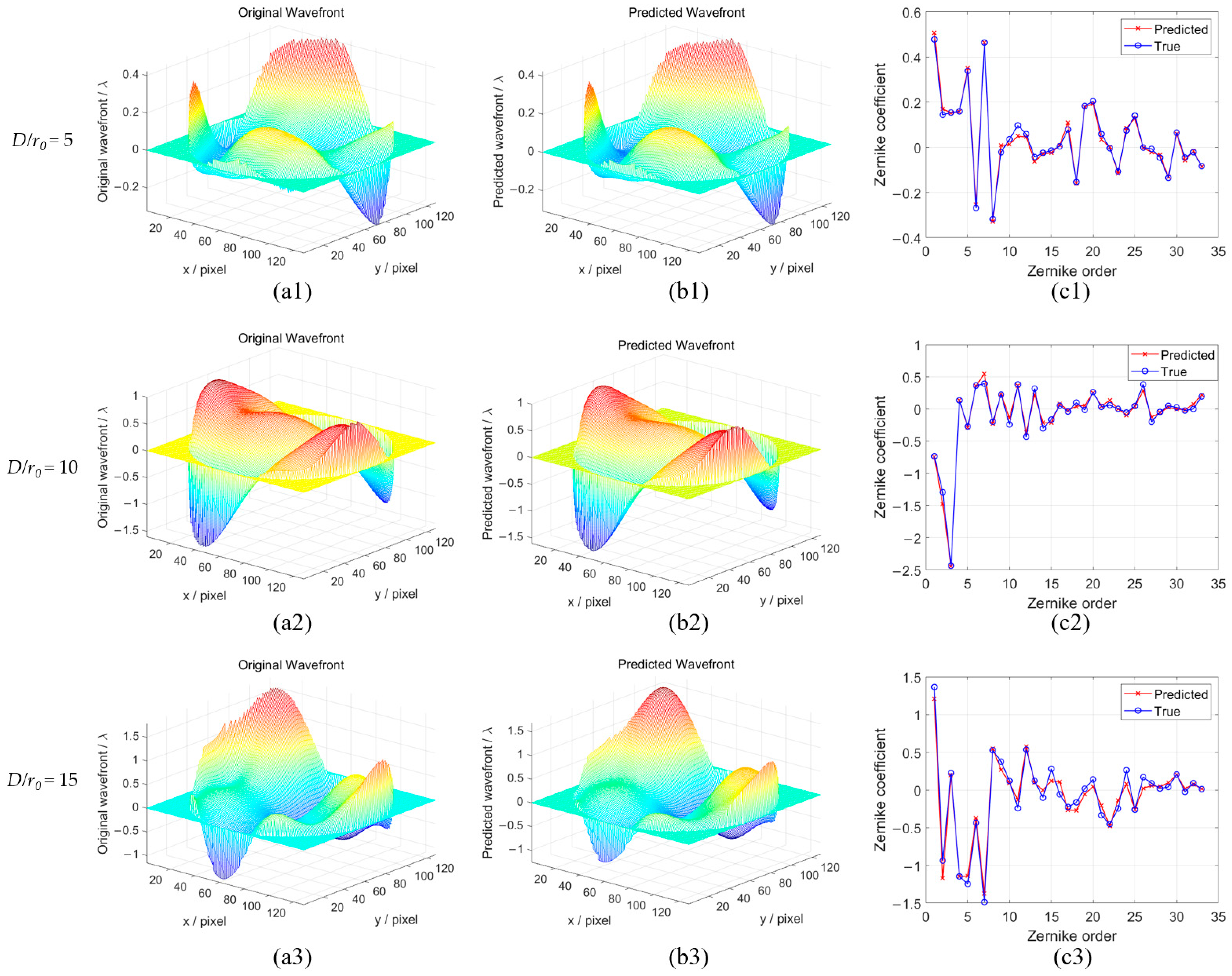 The first column shows the true wavefront, the second column shows the wavefront predicted by EfficientNetV2-S, and the third column shows the residual wavefront aberration. As shown in the figures, across different turbulence intensities, the wavefront reconstructed by EfficientNetV2-S is highly consistent with the 3D morphology of the true wavefront: peak/valley locations and high-order fluctuations are captured with good accuracy, indicating strong nonlinear fitting ability and good generalization in predicting high-order Zernike coefficients.