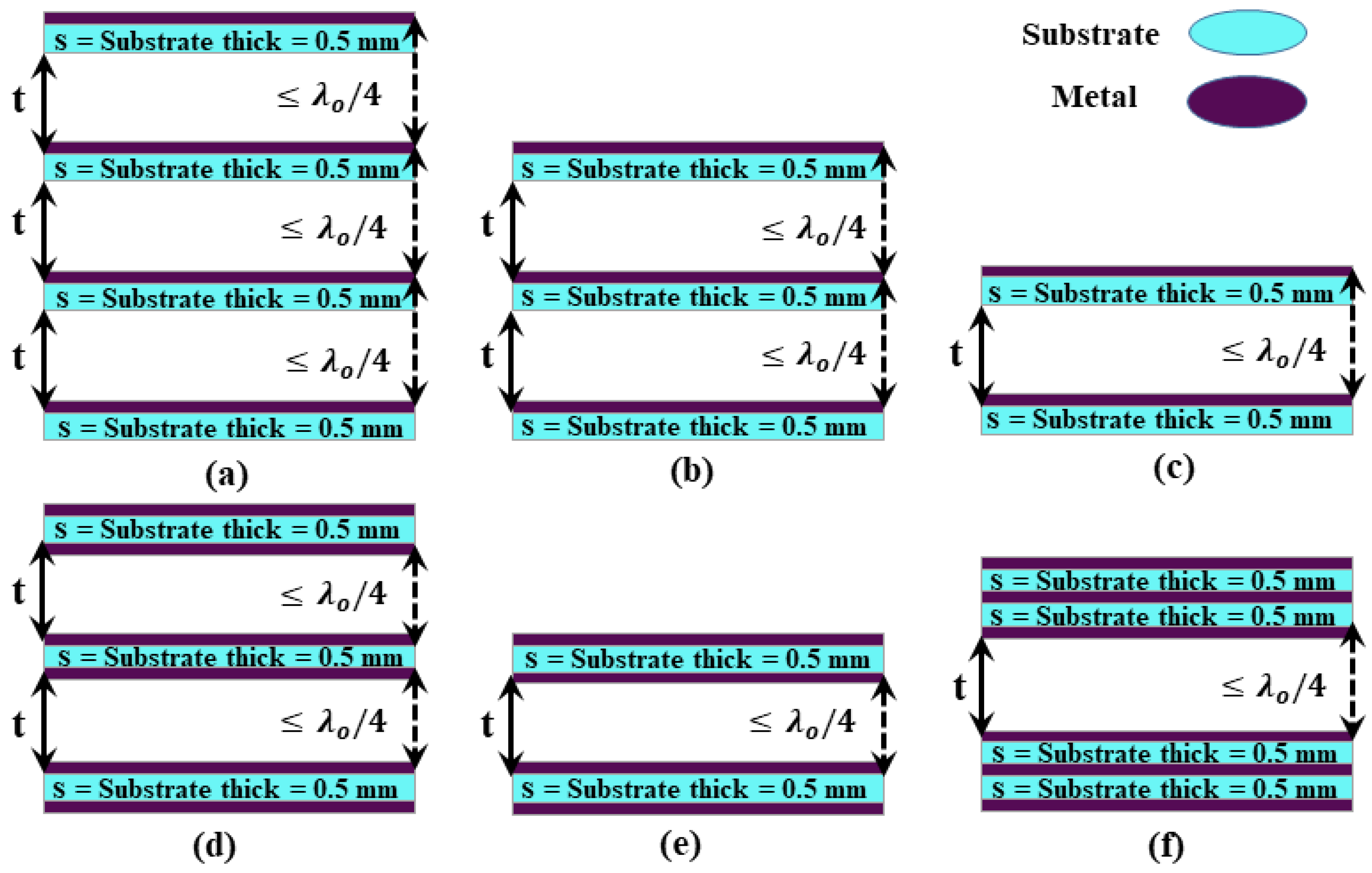 | Types | Single or Both Sides | Substrate Layers | Conductor Layers | Substrate Thickness (s) | Air Gap (t) | Separation Between Layers | Transm. Phase (degree) | Transm. Magnitude (dB) |