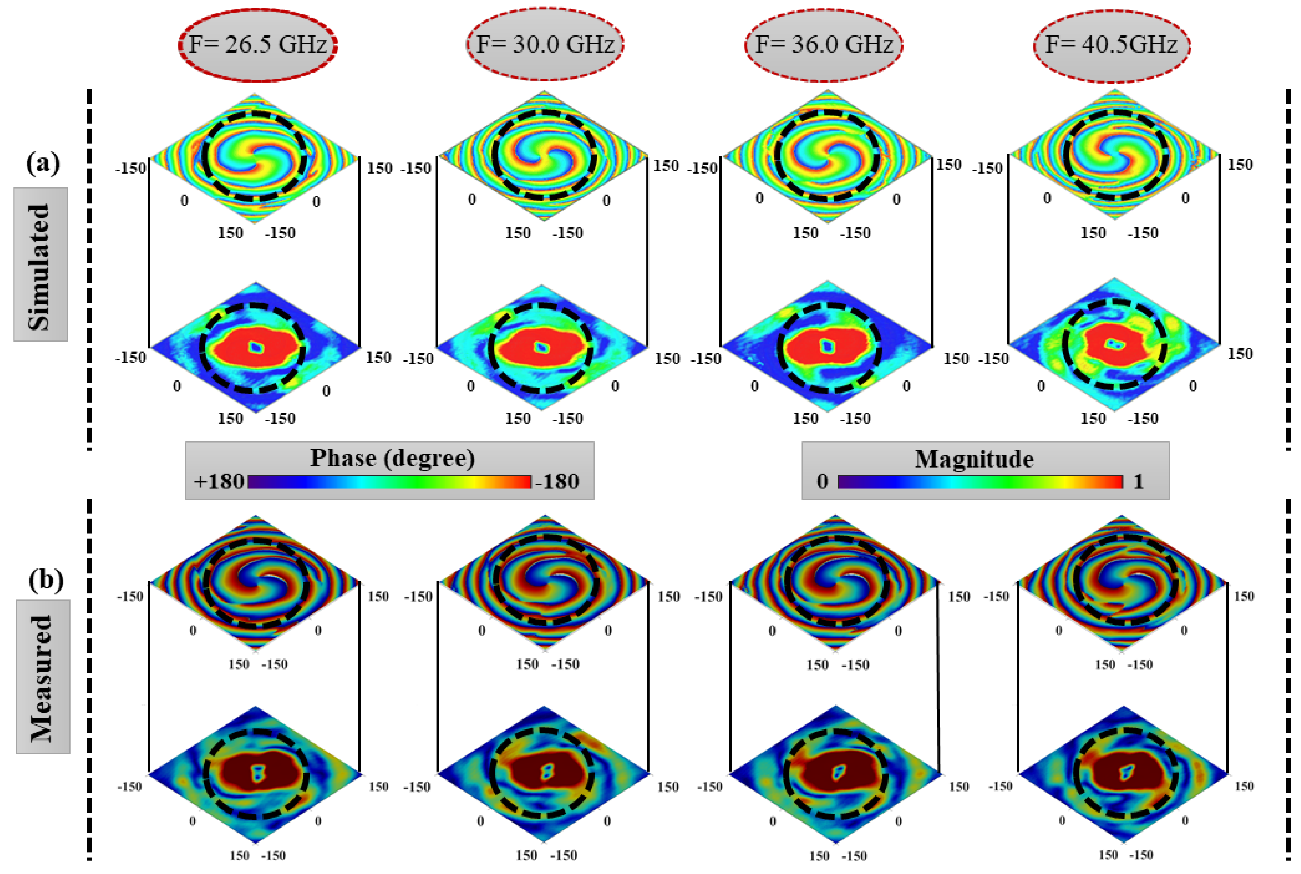 - Ishfaq, M.; Li, X.; Qi, Z.; Zhao, W.; Aziz, A.; Qiu, L.; Memon, S. A transmissive metasurface generating wideband OAM vortex beam in the Ka–band. IEEE Antennas Wirel. Propag. Lett. 2023, 22, 2007–2011. [Google Scholar] [CrossRef]