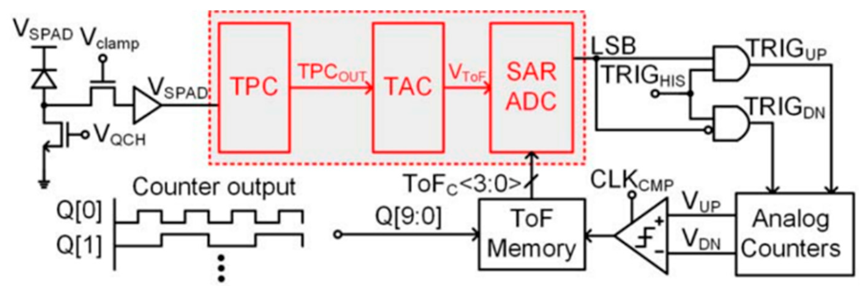 The TDC plays a pivotal role in the functionality of a dToF image sensor. The resolution and dynamic range of the TDC directly influence the precision and depth of the imaging. Typically, SPADs have a sensing range of 100 m, necessitating the use of more sensitive photodetectors to detect objects at longer distances [
