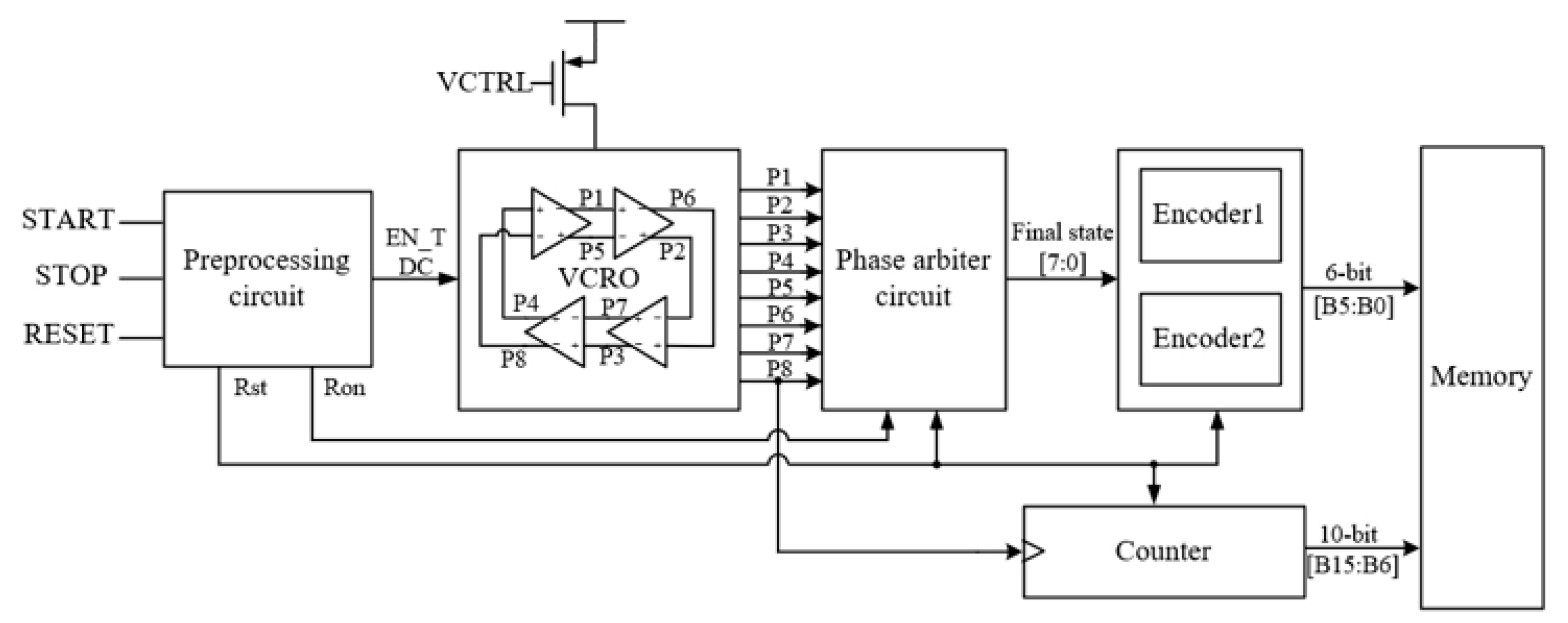 Figure 7, mainly consisting of Start/Stop logic, a counter, a voltage-controlled ring oscillator (VCRO), and an encoder. The Start/Stop logic defines the time interval to be measured and controls the start and stop of downstream circuits; the VCRO oscillates only when the EN signal is high, which helps reduce power consumption. A two-level quantization architecture is adopted for time measurement: the counter performs coarse quantization at the oscillation period level, while the encoder carries out fine quantization of multi-phase clocks. The final-stage phase of the VCRO drives the counter to count the number of full cycles, and the encoder analyzes the states of multi-phase nodes to obtain the fine time margin; the combination of the two enables high-precision measurement.