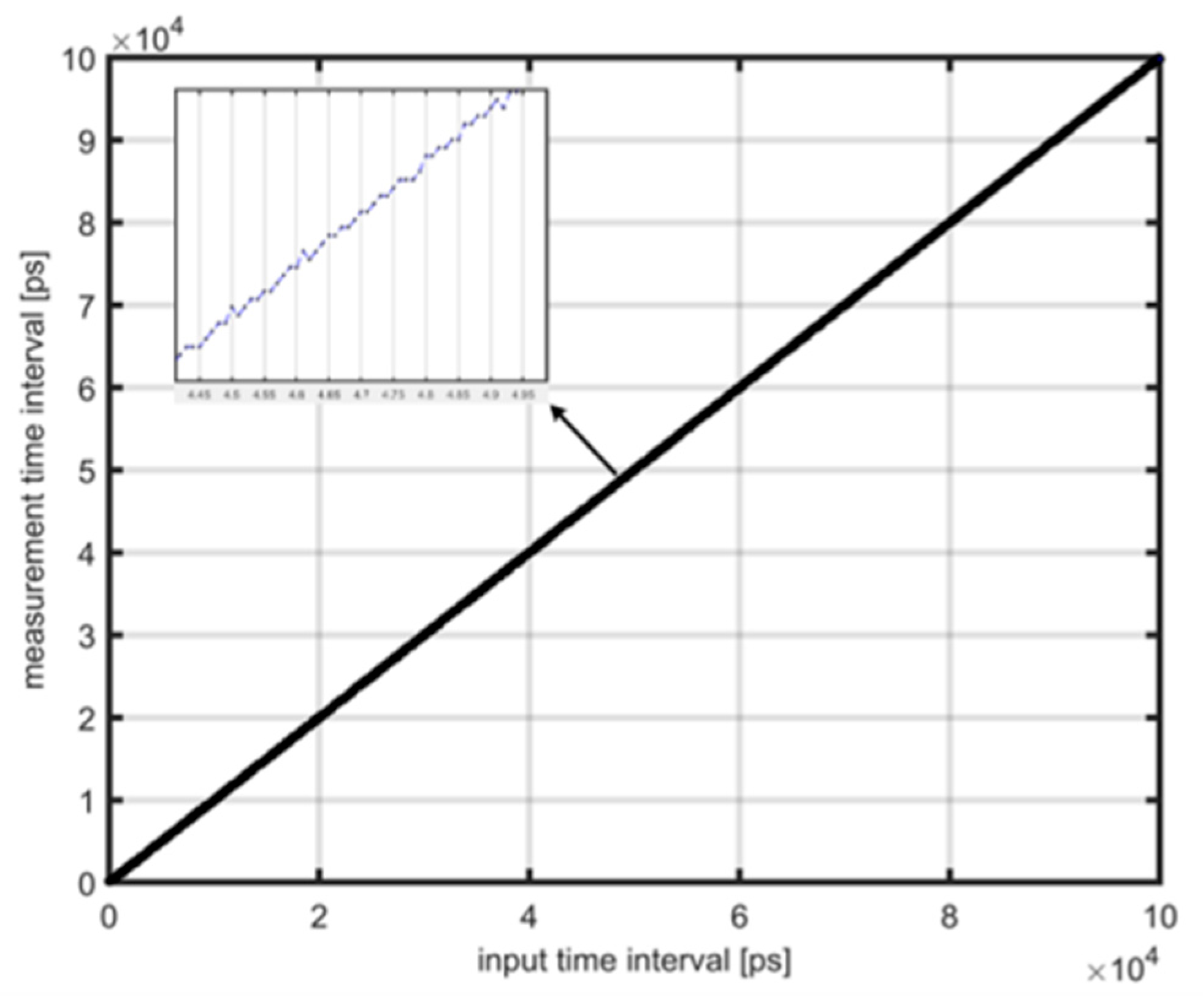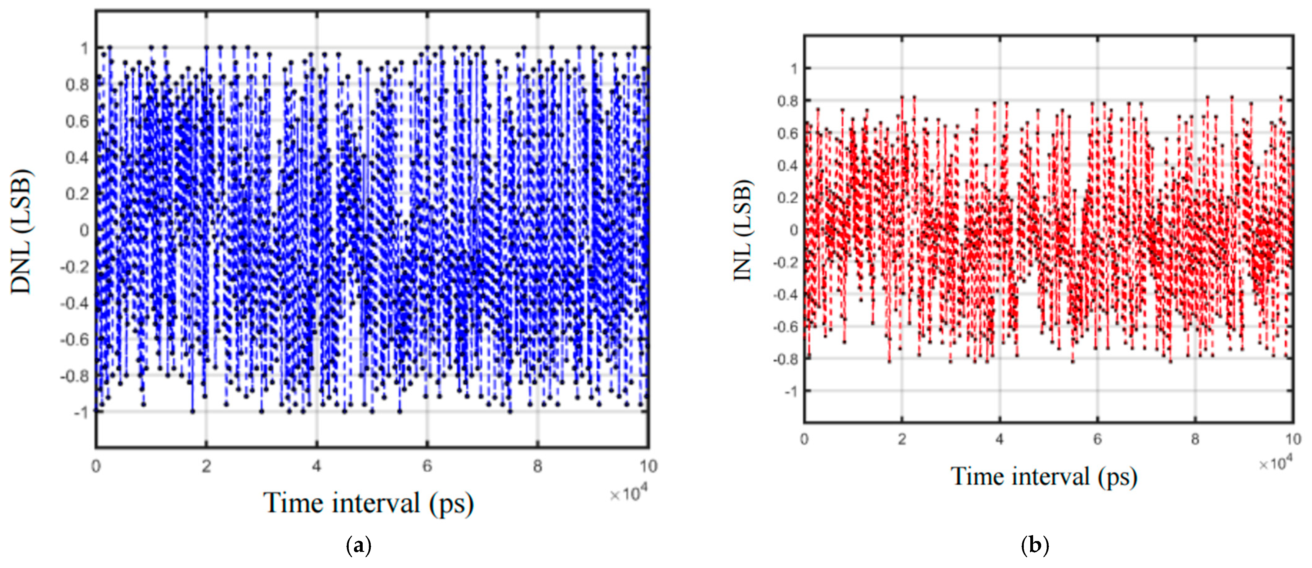 Figure 8b, respectively. The values DNLp-p < 1 LSB and INLp-p < 0.85 LSB indicate that the TDC exhibits good linearity.