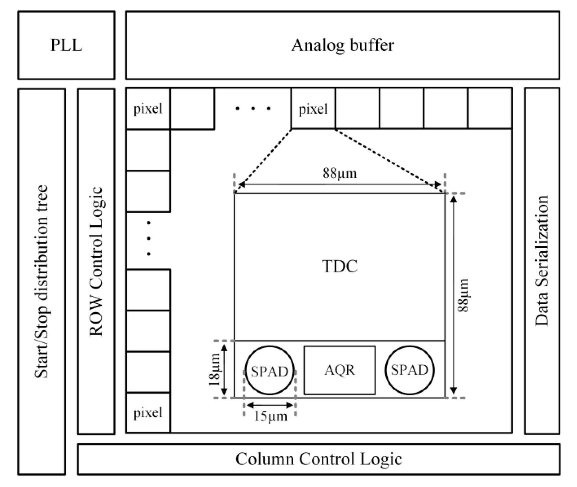 Figure 9. It incorporates an array of 32 × 48 smart pixels, PLL, Analog buffer, Start/Stop distribution tree, ROW Control Logic, Column Control Logic and Data Serialization. Each pixel contains two SPADs that improve photon detection efficiency, an active quenching recharge circuit (AQR) and a TDC. The 32 × 48-pixel array necessitates the utilization of an analog buffer to regulate the oscillation frequency of the ring oscillator within each pixel. The Vctrl is provided by the PLL [