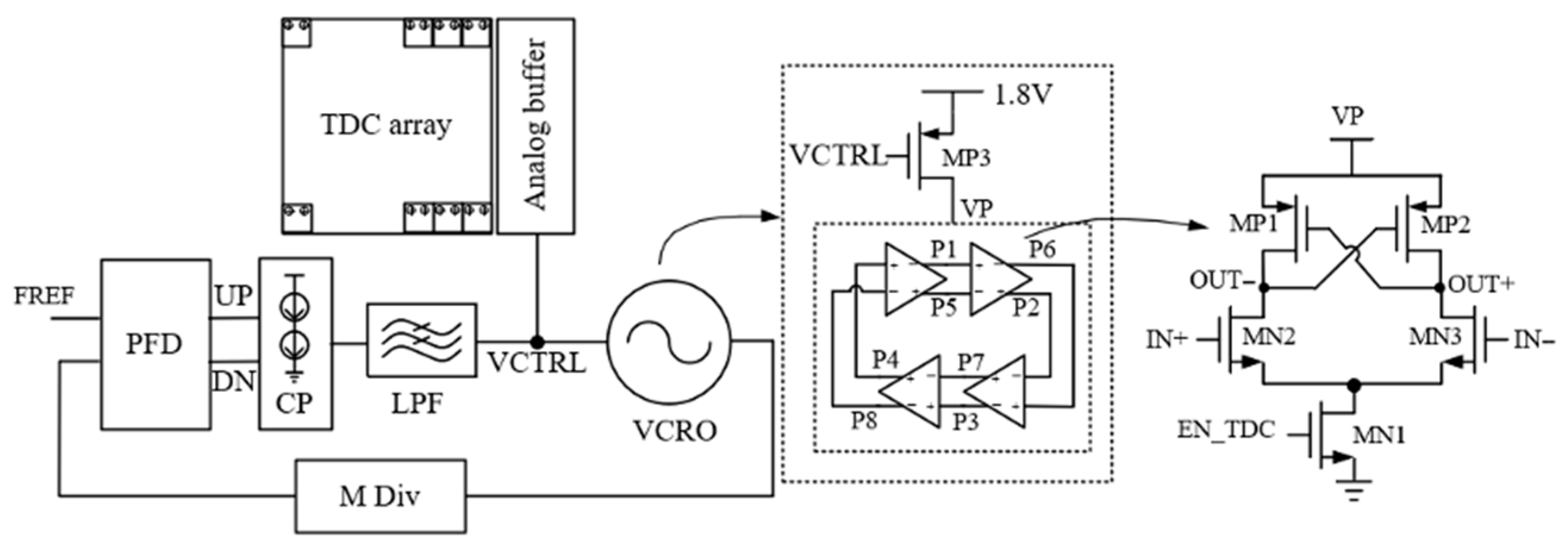 The proposed TDC employs a ring-type voltage-controlled oscillator (VCRO) structure. The TDC and the phase-locked loop (PLL) in this work share an identical core VCRO architecture, both of which exhibit excellent linearity of more than 99% in oscillation frequency versus control voltage [