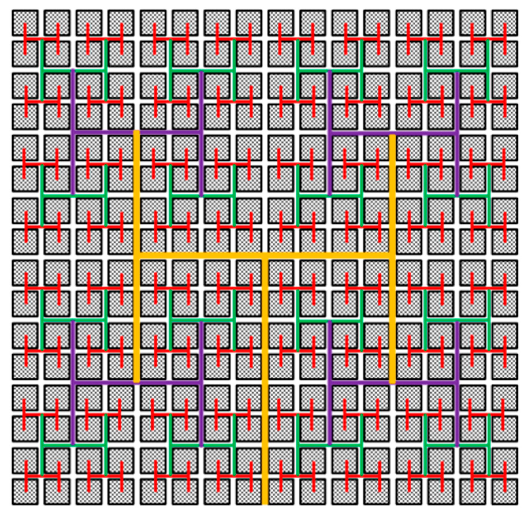 The nested H-tree interconnect structure features a hierarchical topology of “main trunk—branches—sub-nodes”, with the geometric center of the chip as the origin. The main trunk extends outward, and each branch splits at a 1:2 ratio, with the final sub-nodes accurately connected to each 16 × 16 sub-array and individual pixel units. This design ensures identical transmission path lengths for critical signals to all pixels in the array, controlling the transmission delay skew of the LOAD signal and clock within 10 ps to avoid TDC quantization errors caused by inter-pixel timing mismatch. Additionally, equal-width and equal-spacing metal routing, along with rounded branch nodes, are used to reduce signal reflection and crosstalk, adapting to the signal synchronization requirements of large-scale pixel arrays.
