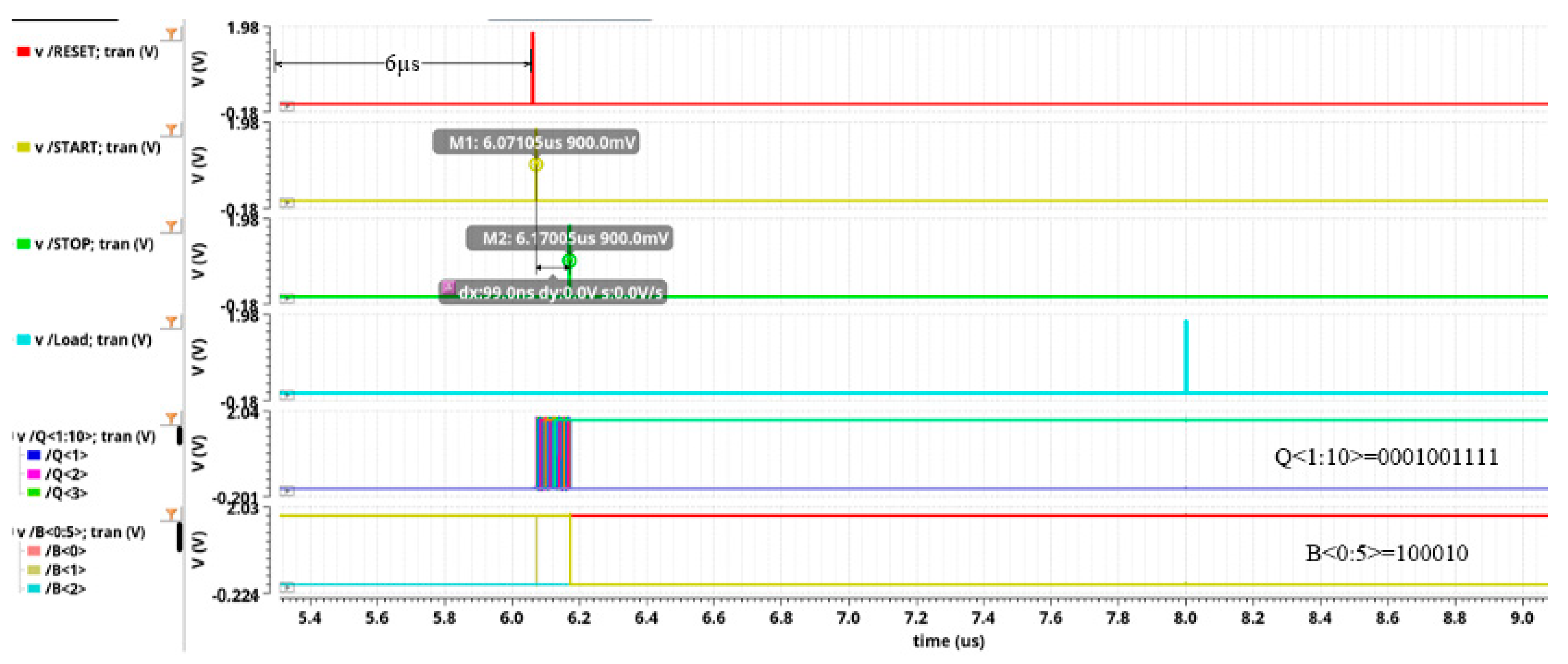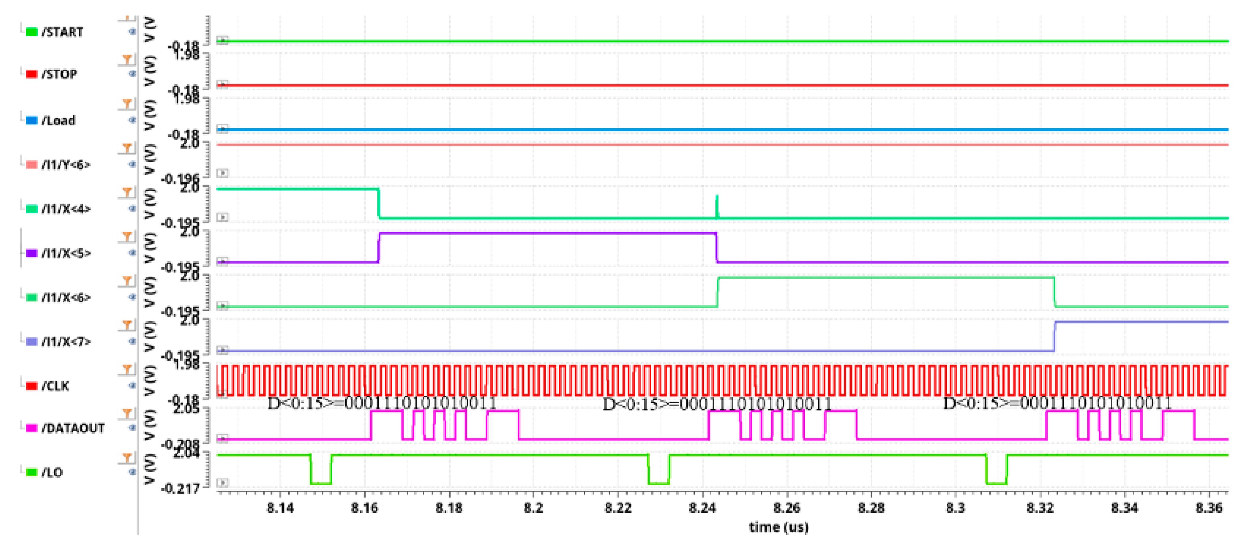 Figure 15, it can be seen that, when the RESET signal is high, the pixel circuit is reset and waits for the START signal to arrive. The arrival time of photons is random, and it is necessary to simulate the arrival time of photons to set the STOP signal. The row select column select timing control circuit opens the control switch in the pixel when X and Y are high and transmits the time-of-flight data of a pixel unit through the PISO circuit. At this time, the input flight time interval is 99 ns, and the quantized digital code is 00010011111100010. According to the formula in (1), the calculated result is 99.063 ns, with an error of less than 156 ps, which meets the requirements. From