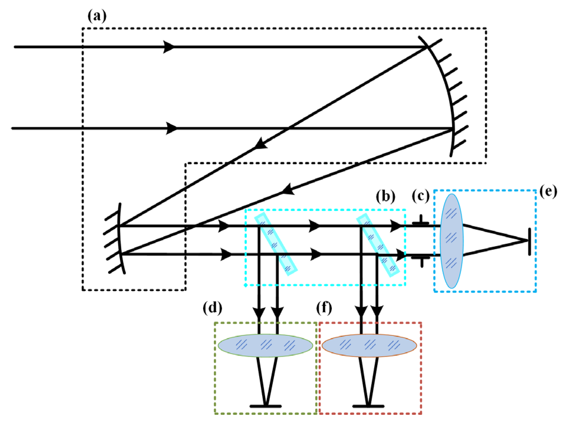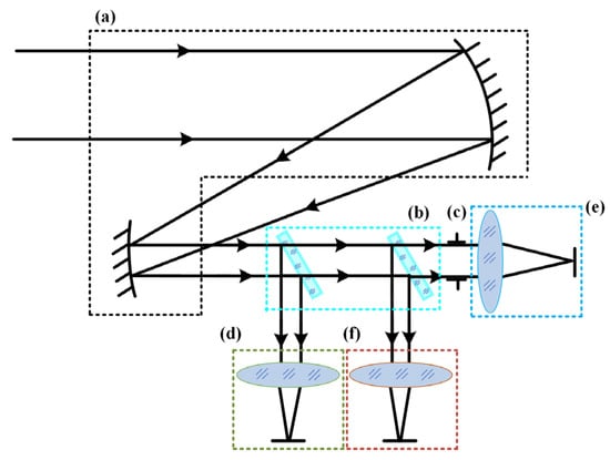 Modular optical path layout of the three-channel common-aperture optical system. Block (a) shows the common-aperture optical path; block (b) shows the beam-splitting components; block (c) shows the exit pupil of front optical path/the entrance pupil of relay optical path; block (d) shows the VIS relay optical path; block (e) shows the SWIR relay optical path; and block (f) shows the MWIR relay optical path.