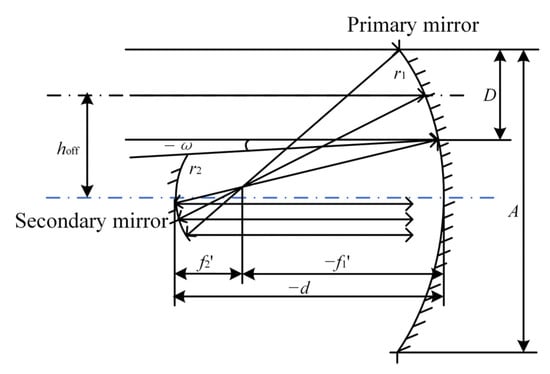 In the set of equations, , , , and represent the third-order aberration coefficients of the system’s spherical aberration, coma aberration, astigmatism, field curvature and distortion, respectively. and represent the conic constants of the primary and secondary mirrors, represents the obstruction ratio of the primary mirror, and represents the lateral magnification of the secondary mirror. By offsetting the aperture stop of the coaxial reflective system, an off-axis reflective system free of central ray obstruction can be obtained, as illustrated in Figure 2. The quantitative relationship between the off-axis distance of the aperture stop and parameters such as the maximum field of view (FOV) of the system can be derived, as expressed in Equation (2).