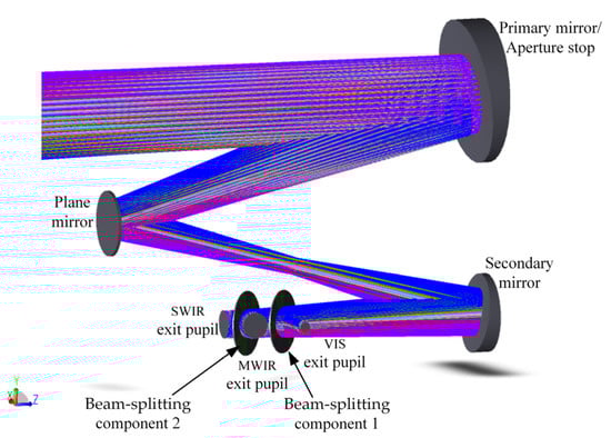 In Figure 2 and Equation (2), denotes the optical aperture of the primary mirror in the coaxial system, represents the aperture stop diameter, refers to the vertex distance between the primary mirror and the secondary mirror, stands for the maximum half FOV angle, and indicates off-axis distance of the aperture stop. The result of the optimized design of the common-aperture optical path is shown in Figure 3. The system is designed as an afocal beam-shrinking system, which compresses the aperture of the light beams to 1/3 of the original size. The beam-splitting components divide the outgoing optical path into three channels, with the exit pupil located at the outgoing channels. A plane mirror is introduced between the primary and secondary mirrors to fold the optical path, reducing the total length of the system. Both the primary and secondary mirrors adopt parabolic surfaces. The maximum aperture of the primary mirror is 220 mm, while that of the secondary mirror is 120 mm. The aperture stop positioned at the primary mirror has an off-axis distance of 250 mm.