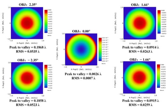 The multi-channel common-aperture optical system enables independent and synchronous multi-band imaging. In addition, the modular layout proposed in the paper reduces the difficulty of assembly of such optical systems. However, the scheme has certain limitations. Although the off-axis design ensures 100% light passing, it introduces additional wavefront distortion to the system, and the phenomenon becomes prominent after integration with relay optical paths. The wavefront diagrams of each channel at different focal lengths are presented in Figure 25, Figure 26 and Figure 27. The maximum PV of the wavefront in the VIS channel is 0.226λ; for the SWIR, the maximum PV reaches 0.347λ; for the MWIR, the maximum PV reaches 0.294λ. The wavefront PV values of each channel are close to λ/4 [17,18], far from the requirements of high-precision detection fields such as aerospace and medicine. For conventional target detection corresponding to the design requirements in the article, the wavefront aberration induced is negligible. However, with the improvement in detection accuracy, the accurate compensation is crucial for applications in astronomy, medicine and other fields [26].