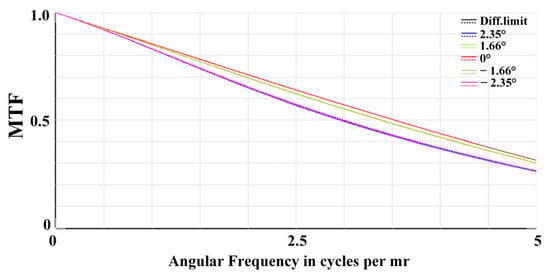 The image quality is evaluated based on the wavefront aberration and the modulation transfer function (MTF). Taking the maximum FOV as an example, Figure 4 shows the wavefront distribution of the common-aperture optical path. According to the Rayleigh criterion, a system approaches the diffraction limit when the peak-to-valley (PV) of the wavefront ≤ λ/4 and the root mean square (RMS) ≤ λ/14 [17,18]. In the figure, the maximum PV is 0.1868λ and the maximum RMS is 0.535λ. Figure 5 presents the MTF curves, where the solid lines represent the tangential direction and the dashed lines represent the sagittal direction. The MTF curves are concentrated and close to the diffraction limit, and the wavefront distribution and MTF curves effectively ensure the imaging quality of the front optical path.
