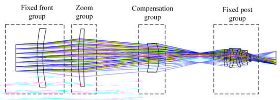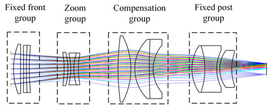 The design of zoom systems is generally based on the optimization of existing patented structures, which is limited by the selected structural layout and lacks flexibility, and struggles to meet the requirement of placing the entrance pupil in the front row [19]. To address the issue, the paper proposes a calculation method for the initial structure of the zoom systems, based on the four-element zoom principle of Gaussian optics theory [20] and optical design software. Firstly, the zoom principle and its equations are derived theoretically. The system achieves continuous focal length variation with a fixed total length through the linkage of the zoom group and the compensation group. Thus, only the linked groups need to be analyzed; see Figure 6.